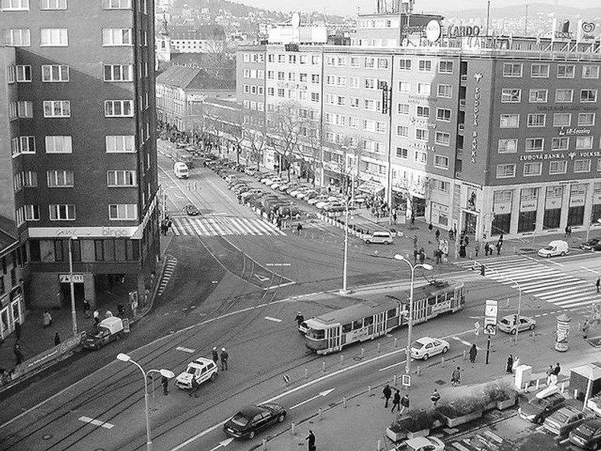 V roku 1931 totiž dokončili budovu Mestskej sporiteľne (podľa projektu Jura Tvarožka) z terasy najvyššieho poschodia ktorej fotograf vtedy ešte obrovskou plochou pôsobiace námestie fotografoval. V roku 1935 už nemohol záber zopakovať, lebo na mieste jednoposchodového domu, ktorý vľavo vyčnieva do námestia, vyrástol Manderlov mrakodrap projektovaný architektom Christianom Ludwigom v spolupráci s Ernestom Spitzerom.