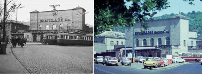 Na pravej strane tejto fotografickej koláže je priestranstvo pred Hlavnou stanicou takisto plné zaparkovaných osobných áut, ktoré na rovnakom mieste stávajú dodnes...