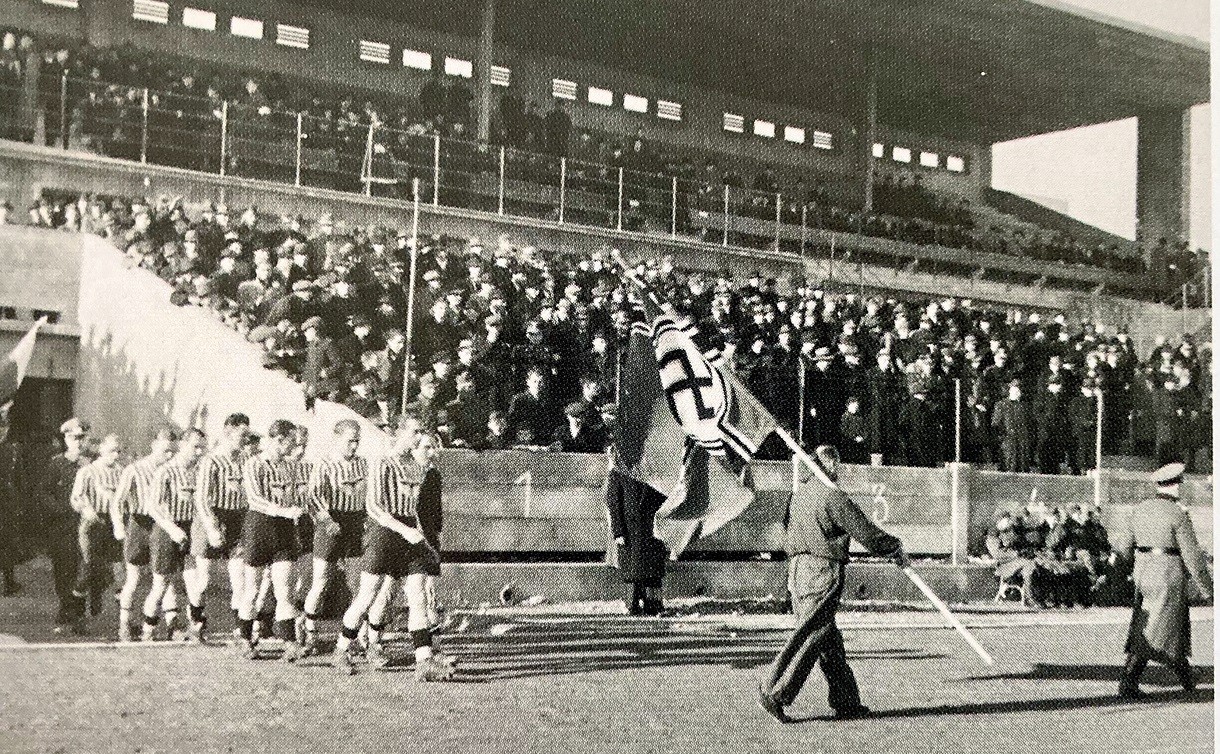 Nástup mužstiev slovenskej armády a Wehrmachtu na futbalový zápas v novembri 1941.