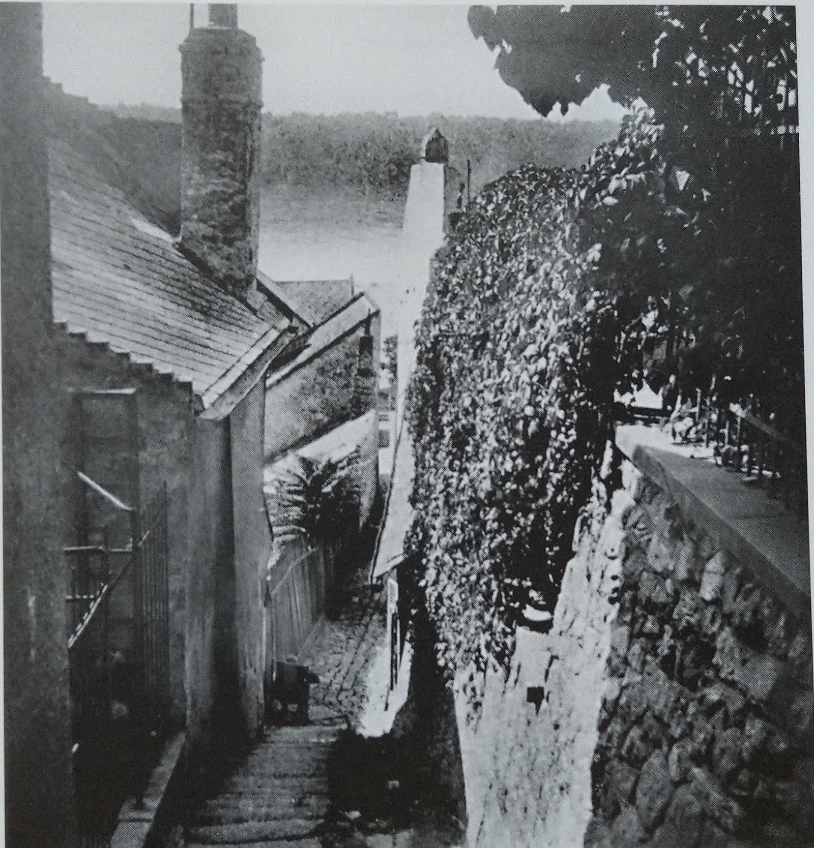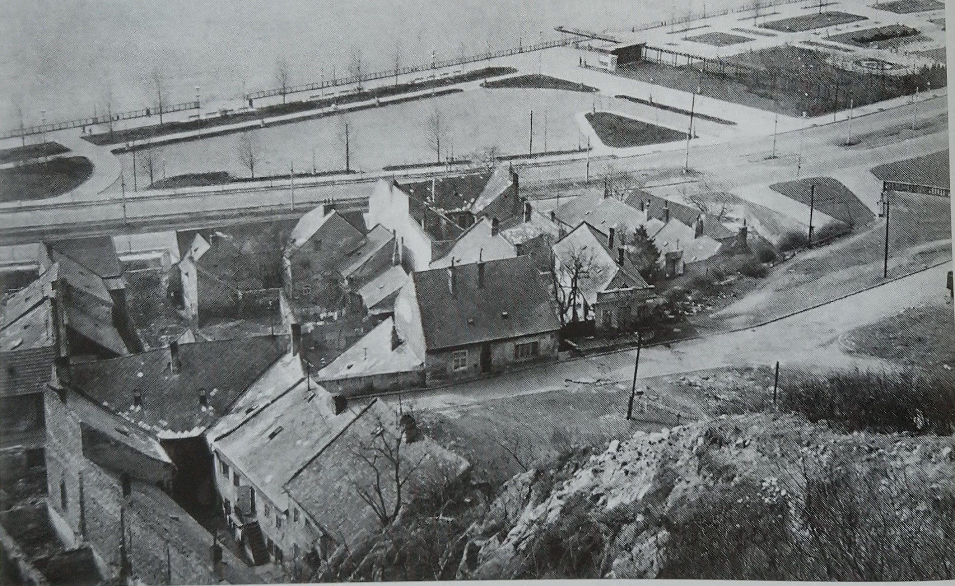 Pohľad na západný koniec Zuckermandlu s Messerschmidtovým domom uprostred.