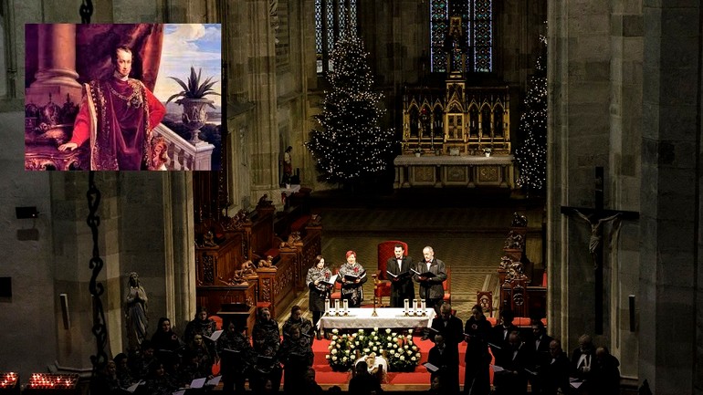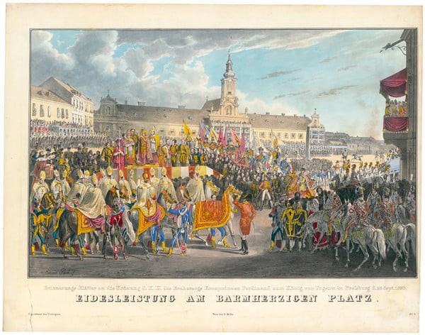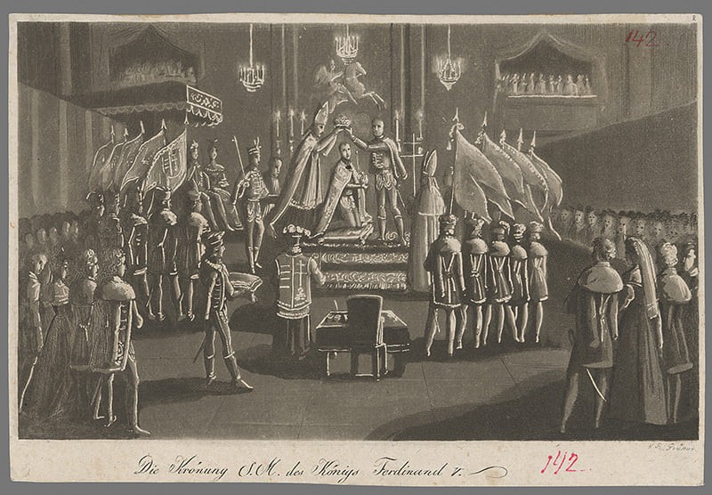 "Po pol ôsmej sa z prímasovho paláca pohol sprievod do Dómu sv. Martina. Do chrámu prišli všetci v slávnostnej procesii. Cisára a cisárovnú posadili na tróny vľavo od oltára, princa do stredu. Pred začiatkom obradu si budúci kráľ pokľakol pred svojho otca cisára Františka I., ktorý mu dal požehnanie. Obrad korunovácie viedol kardinál Alexander Rudnay. Bol jedným z mála príslušníkov vysokej cirkevnej hierarchie šľachtického pôvodu, ktorý sa hlásil k slovenskej národnosti," pokračuje príspevok k 191. výročiu korunovácie Ferdinanda V.