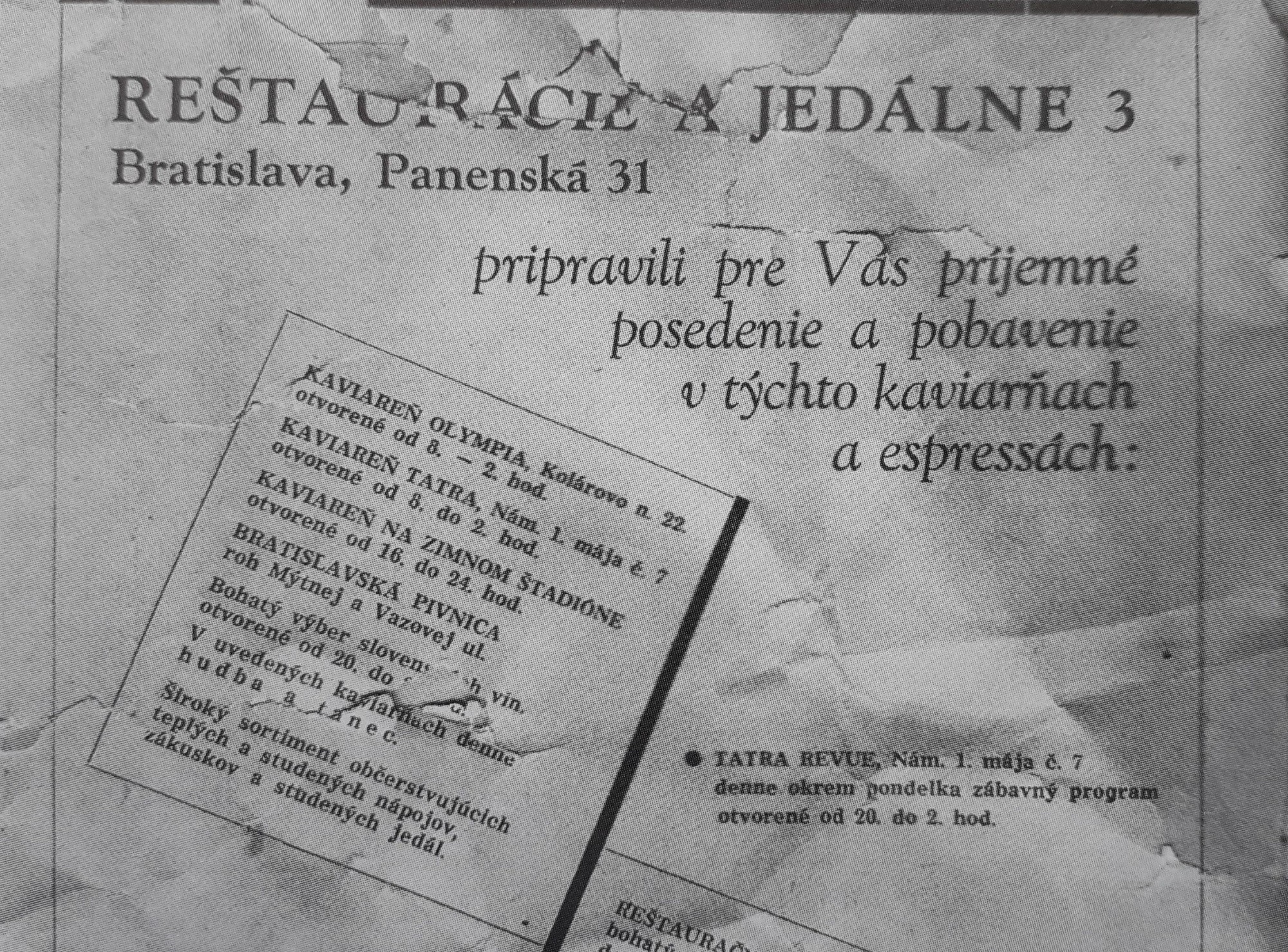 Spracované podľa knihy Juraja Šeba Kaviarne, krčmy a vinárne v Bratislave 1960 – 1986 (so súhlasom vydavateľstva)