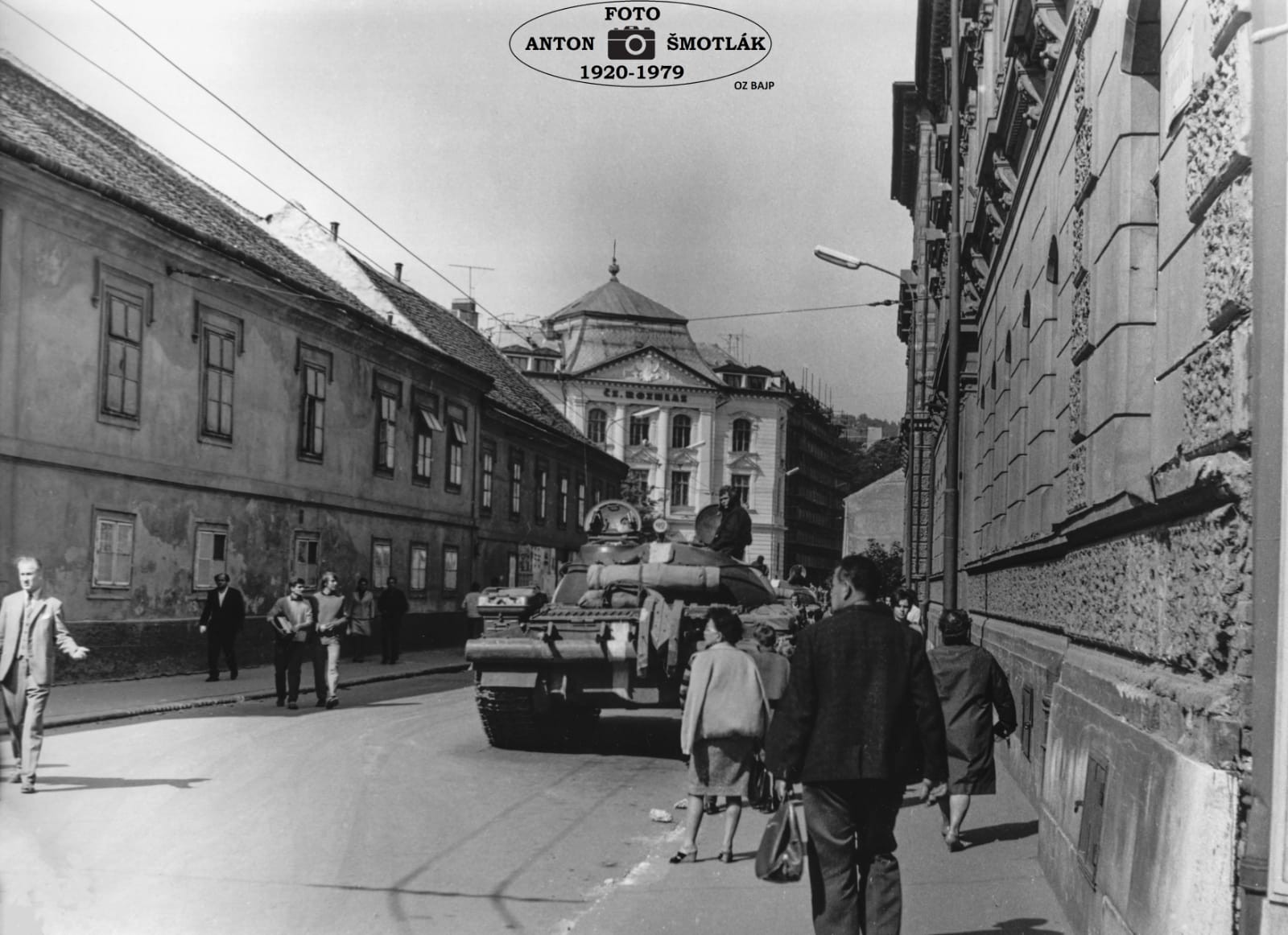 Na prvej fotografii môžeme vidieť ruský tank na Župnom námestí, pohľad je smerom k budove starého rozhlasu na Zochovej.