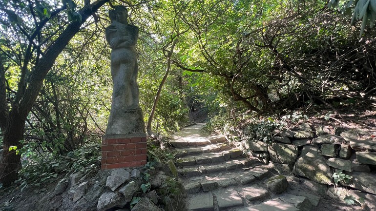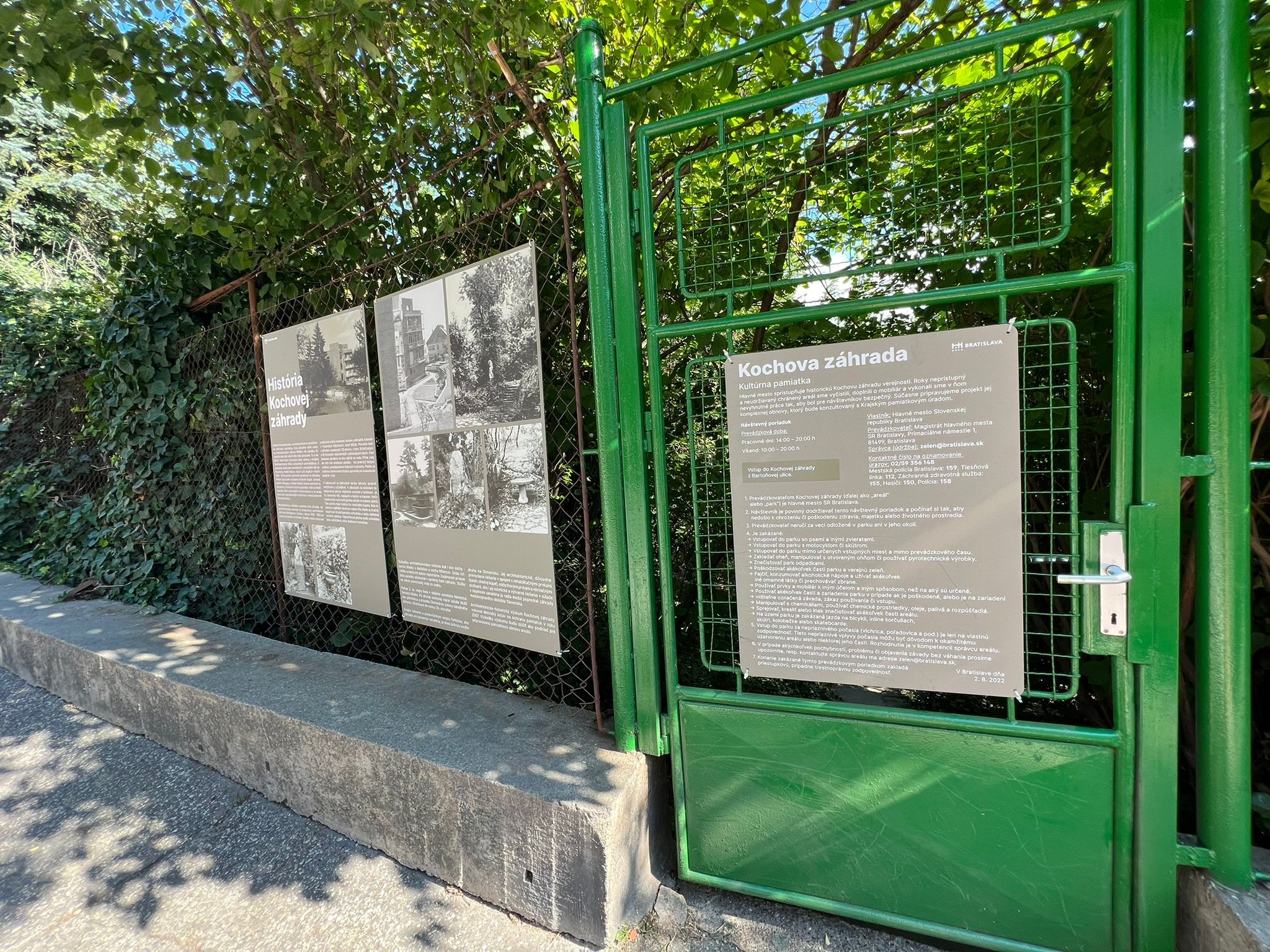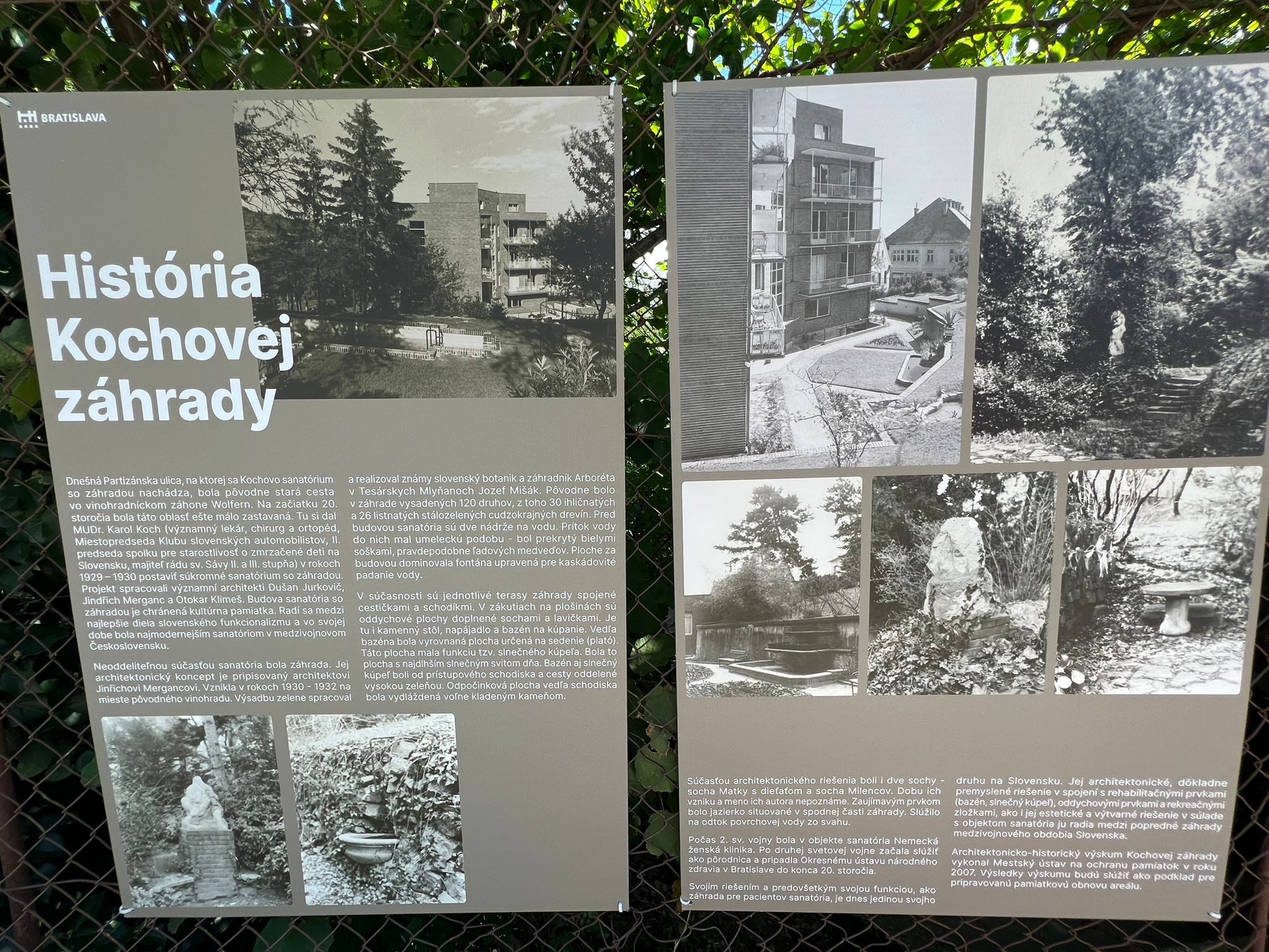 Históriu Kochovej záhrady a sanatória približuje aj informačná tabuľa pred vstupom. Ten je z Bartoňovej ulice (nad sanatóriom).