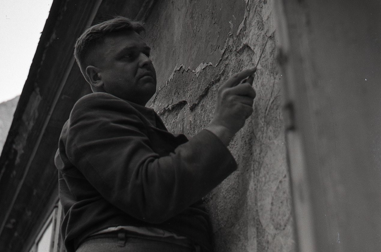 Rok 1947: Alfred Piffl pri renovovaní budovy na rohu Rybnej brány a Laurinskej ulice.