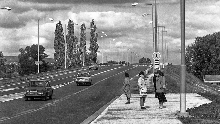 V priebehu uplynulých 34 rokov sa v okolí estakády, ktorá je pokračovaním Jantárovej cesty, všeličo zmenilo. Zastávka MHD, kde v októbri 1989 čakali dámy na svoj spoj (možno sa niektorá z nich spozná?), slúži len nočným autobusom, dnes sa do centra mesta pohodlne odvezieme električkou v priebehu pár minút. Z Jantárovej cesty sa autom na Starý most už nedostaneme, kto chce ísť cez Dunaj, musí odbočiť k Sadu Janka Kráľa a pokračovať po Einsteinovej ulici k Mostu SNP.
