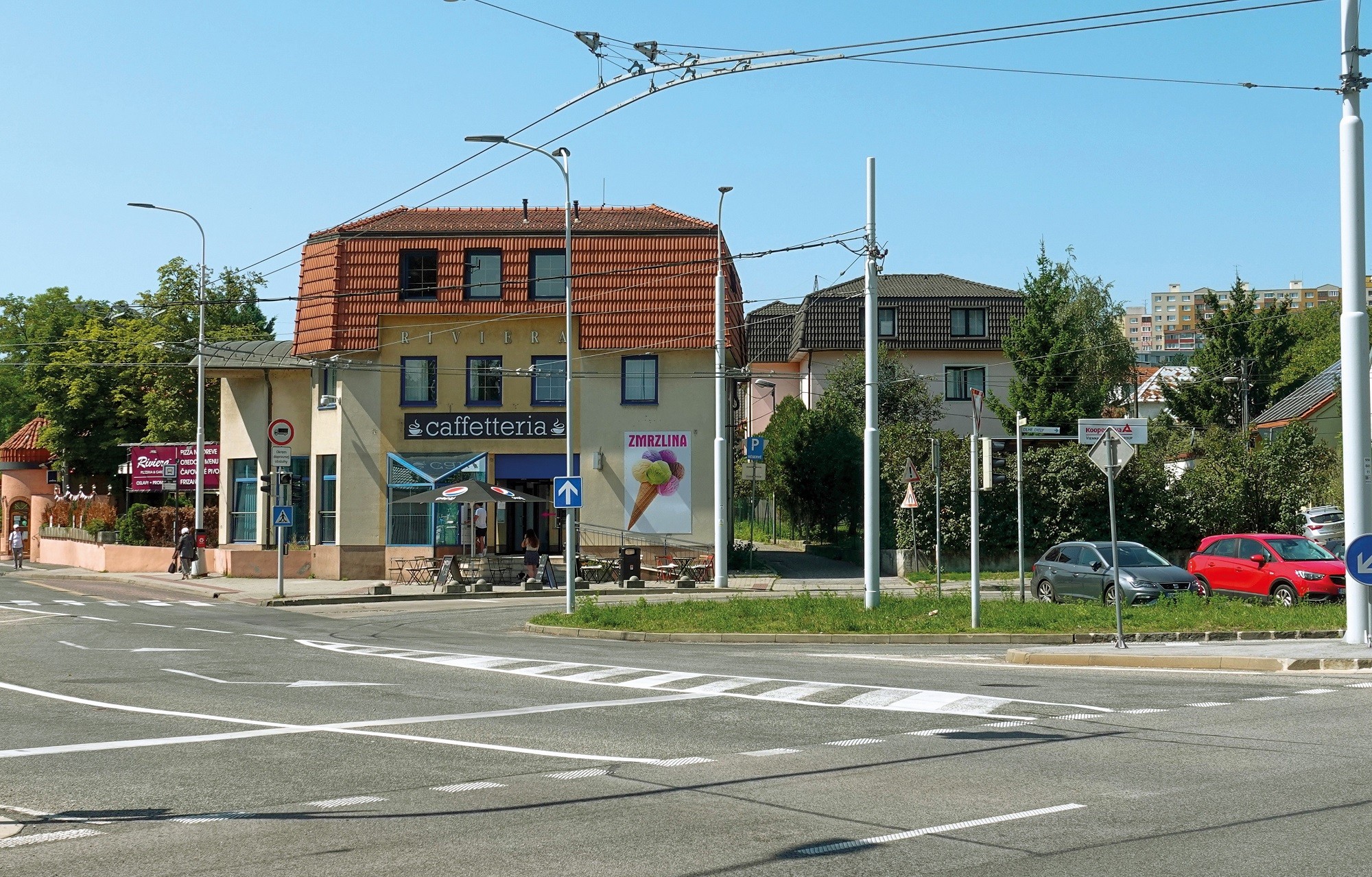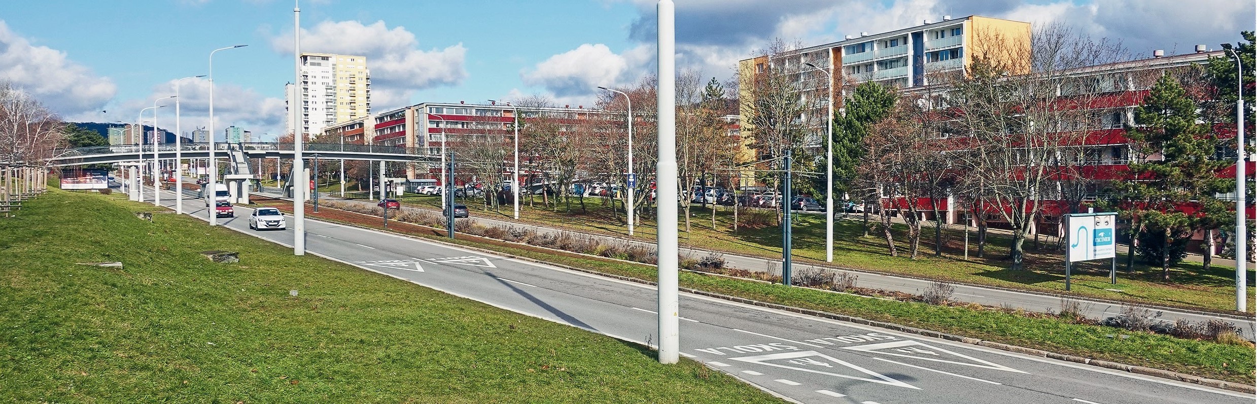 Rok 2023: Na zábere vidieť už dvojsmernú Karloveskú ulicu a električkovú trať do Dúbravky.