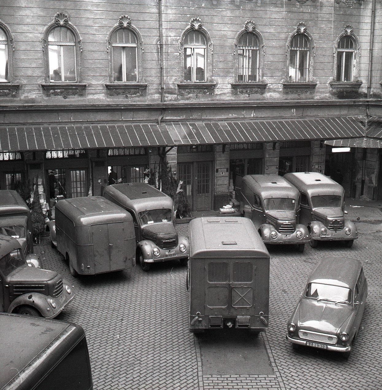 Rok 1966: Predvianočný čas bol rušný aj pre poštárov. Cez balíkové oddelenie Pošty 1 na Námestí SNP prešlo k 22. decembru 1966 až 80-tisíc balíkov, z toho bolo 13-tisíc vianočných stromčekov. Pohľad na nádvorie pošty: 26 áut rozváža zásielky po Bratislave.