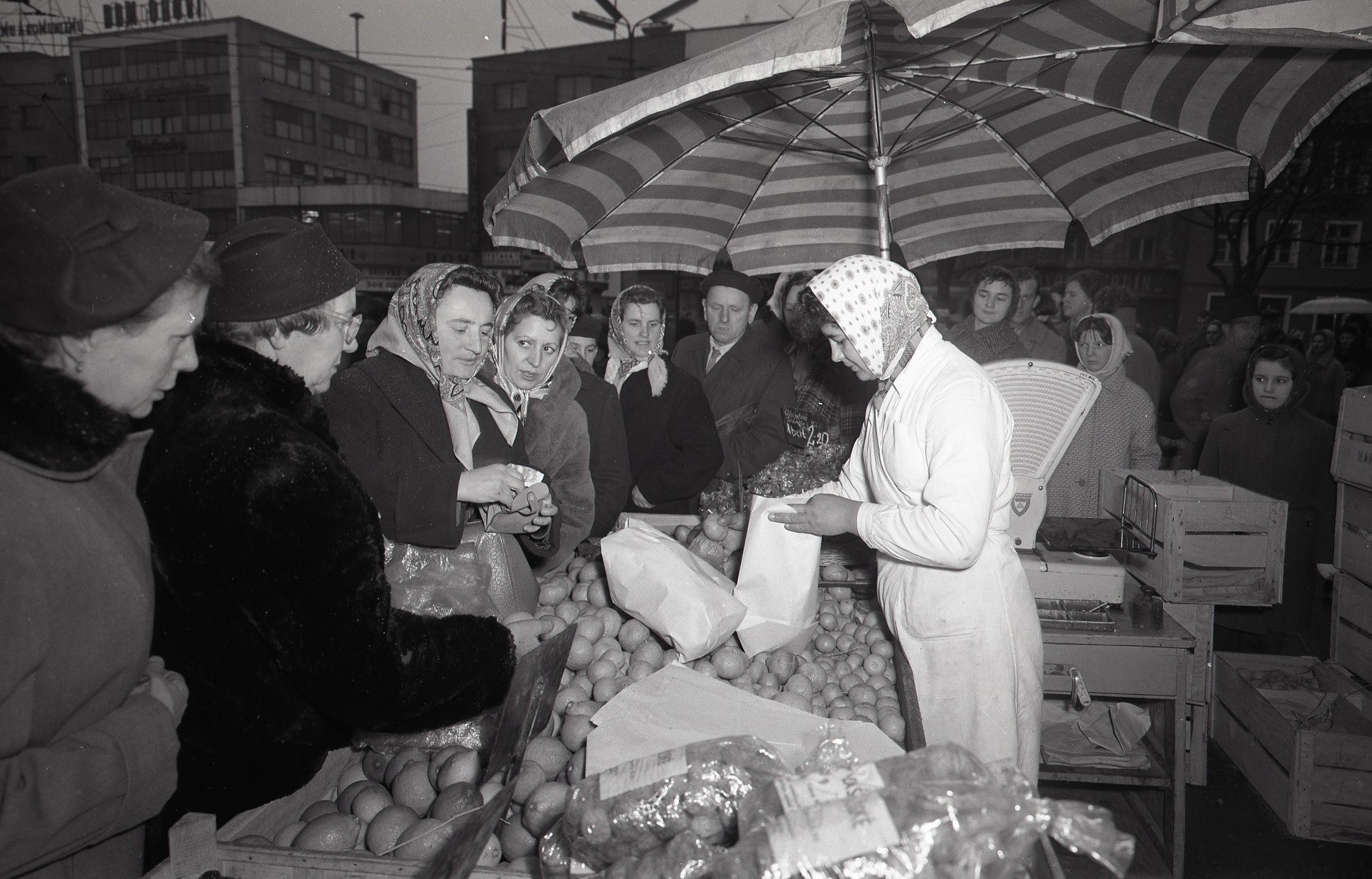 Rok 1960: Predvianočné nákupy vrcholili Zlatou nedeľou. Rušno bolo nielen v obchodoch, ale aj na ulici, kde sa dali kúpiť i chutné mandarinky – v decembri 1960 napríklad aj oproti Domu obuvi „Veľký Baťa“.