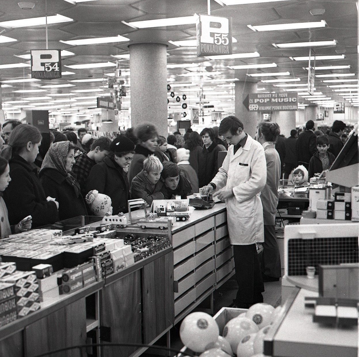 Rok 1975: Dôkazom blížiacich sa Vianoc boli aj vyzdobené výklady obchodných domov a nával kupujúcich. Takto to vyzeralo pri pokladniciach už v prvé dni decembra.