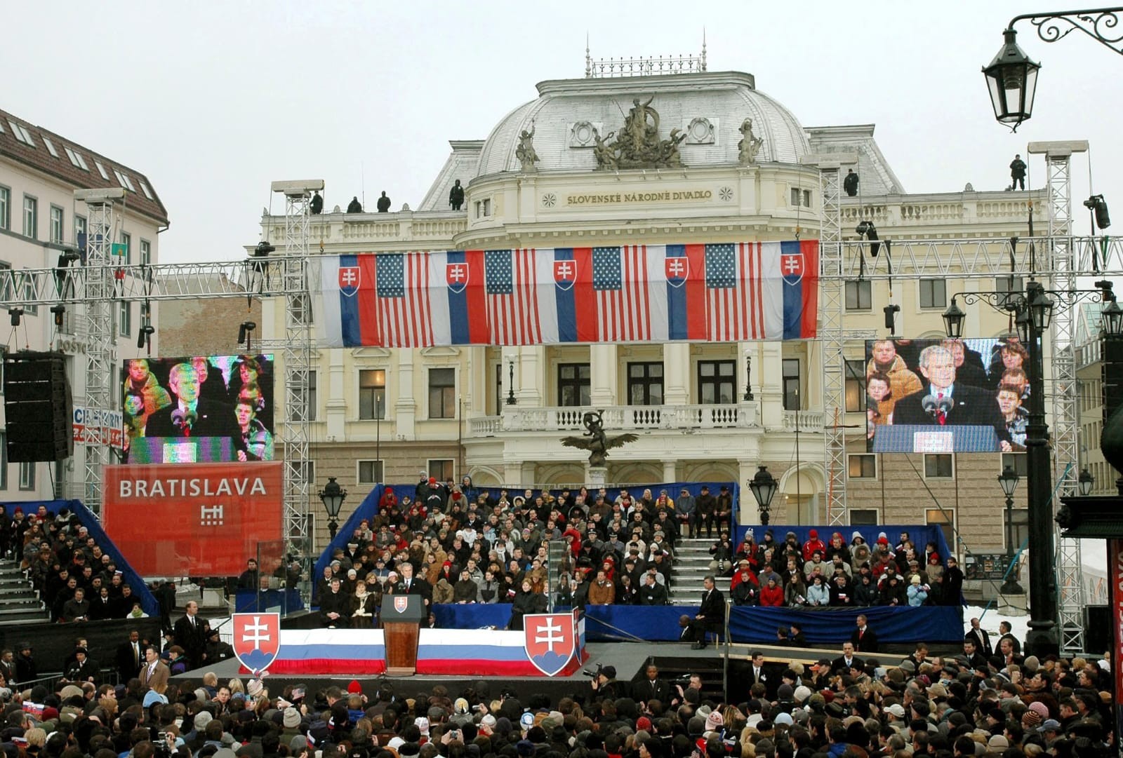 Prejav Georga Busha mladšieho si na Hviezdoslavovom námestí vypočuli tisíce ľudí, podujatie sprevádzali prísne bezpečnostné opatrenia.