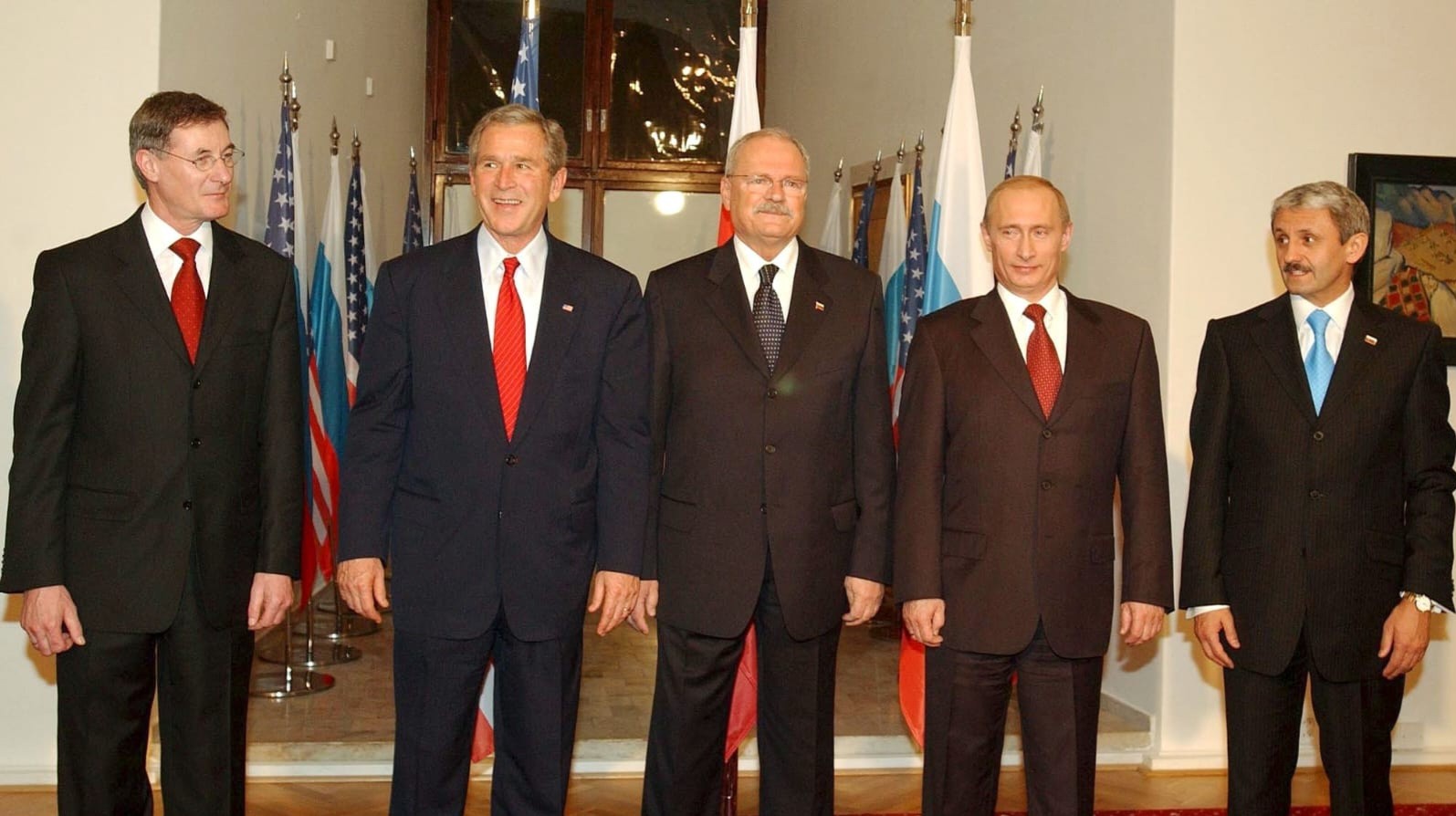 Predseda parlamentu Pavol Hrušovský, George Bush mladší, prezident Ivan Gašparovič, Vladimír Putin a premiér Mikuláš Dzurinda.