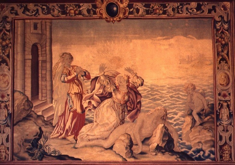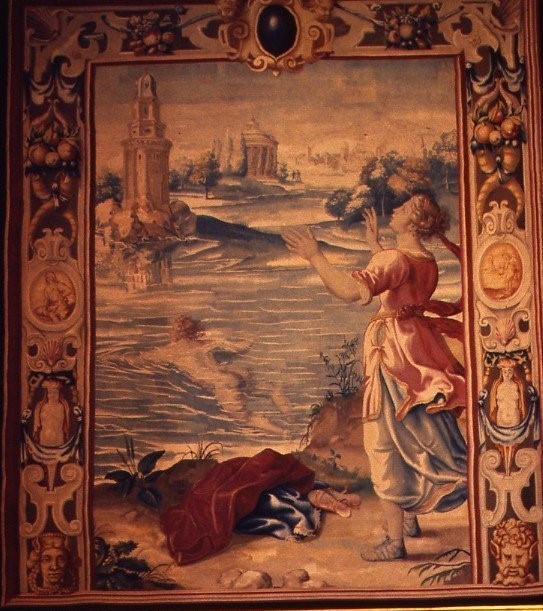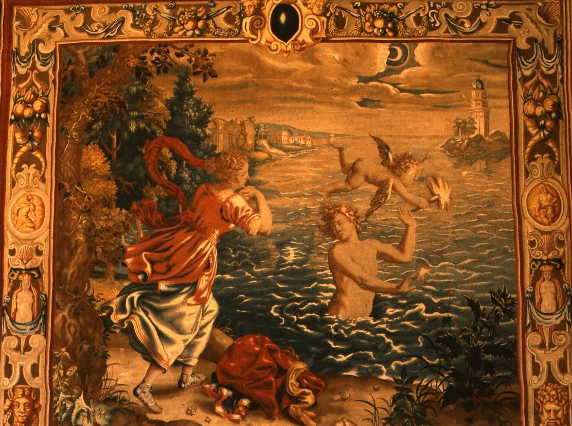 Dnes už poznáme aspoň pôvod nádherných diel. Vyhotovili ich v anglickej tkáčskej dielni v Mortlake podľa návrhov maliara Francisa Cleyna. Zobrazujú starogrécku báj o tajnej láske Afroditinej kňažky Héro a gréckeho mládenca Leandra z mesta Abydos na pobreží Hellespontu (dnešné Dardanely). Krásna Héro pod sľubom doživotného panenstva udržiavala večný oheň v chráme mesta Sésta na tráckej strane Hellespontu. Aby sa zaľúbenci mohli stretávať, musel Leandros pod rúškom noci dvakrát prieliv preplávať – večer ta, nadránom späť. Héro zakaždým postavila do okna v chrámovej veži lampu, aby v tme nezablúdil. Počas jednej búrlivej noci však silný vietor lampu sfúkol, Leandros stratil orientáciu a utopil sa v mori. Keď Héro objavila ráno jeho mŕtve telo, v zúfalstve sa vrhla do rozbúrených vĺn. Tento príbeh zobrazuje päť tapisérií, na šiestej je smútiaci Amor s dolámaným lukom.