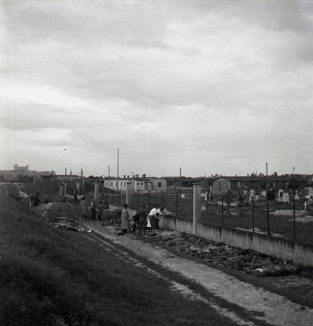 Masové hroby objavili na vonkajšej strane starého petržalského cintorína. Foto je zo 4. mája 1945.