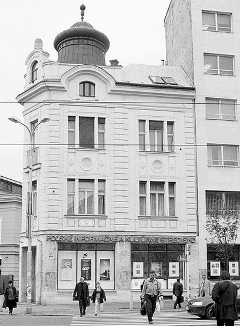 Ozdobná strecha nad nárožím nového domu (číslo 7) pripomínala barokové strechy veží, napríklad na Michalskej, a akoby symbolizovala nový vstup do stredovekého mesta. Dom postavili v rokoch 1910 až 1911 ako obytný a bankový palác. Projekt vypracoval architekt N. Katser.