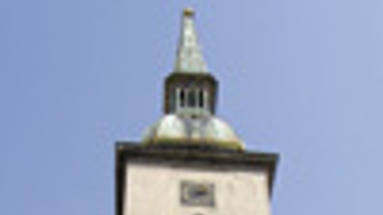 Veža chrámu bola pomerne nízka, s jediným podlažím nad úrovňou hrebeňa strechy. Tam viseli zvony. Nárožia veže boli ozdobené kamennými sochami svätcov na konzolách pod gotickými baldachýnmi.