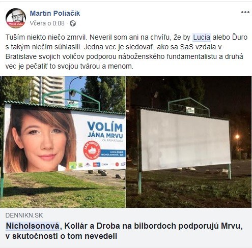 Bilbordy zjavne prekvapili aj bývalého straníckeho kolegu spomínanej dvojice Martina Poliačika. "Neveril som ani na chvíľu, že by Lucia alebo Ďuro s niečím takým súhlasili. Jedna vec je sledovať, ako sa SaS vzdala v Bratislave svojich voličov v prospech náboženského fundamentalistu a druhá vec je pečatiť to tvárou a menom," uviedol Poliačik na sociálnej sieti.