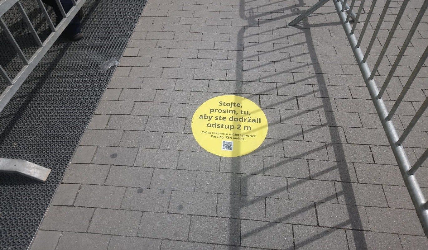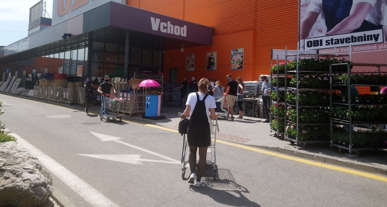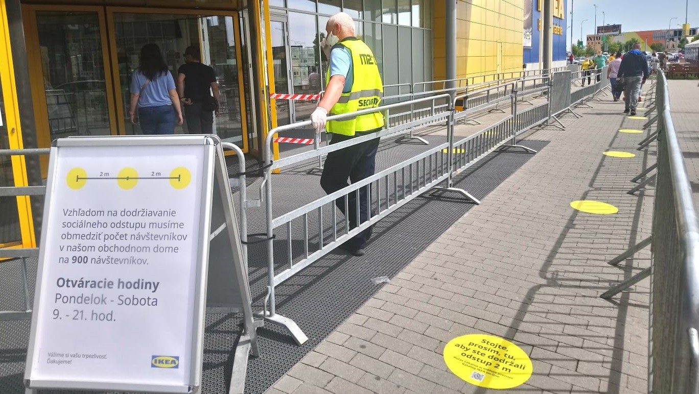 Vybrali sme sa i na východnú časť mesta neďaleko letiska, kde sa nachádza niekoľko predajní nábytku. Aj tu bol záujem kupujúcich enormný. Pokiaľ ide o známeho švédskeho predajcu, vďaka jeho obrovskej ploche sa rad netvoril. V obchode totiž môže byť naraz až 900 ľudí (podľa noriem dokonca viac, no predajca si sám určil túto nižšiu hranicu). Pred vchodom stál esbeeskár a každého zákazníka vítala pani s dezinfekciou rúk. Pre prípadných čakajúcich bol vytvorený zo zábran koridor, v ktorom boli jasne vyznačené miesta na státie s dostatočným rozostupom dva metre. Plastové vozíky naozaj poctivo dezinfikovali.