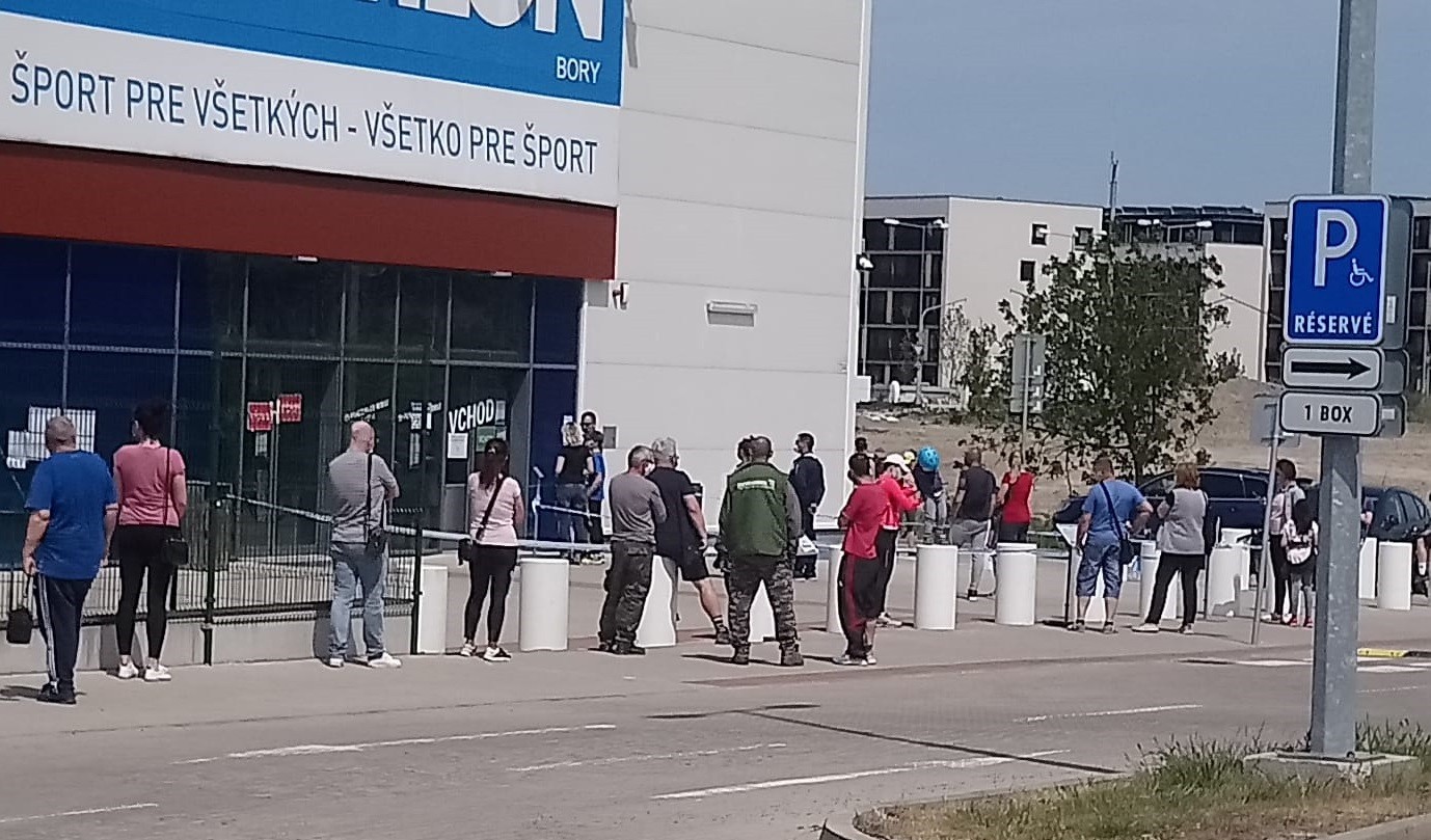 Keďže obchody boli zatvorené i v piatok (8. máj) a rovnaký osud ich čaká aj v nedeľu, plno bolo aj v tých prevádzkach, ktoré sú otvorené dlhodobo. Presvedčili sme sa o tom pri potravinách v Karlovej Vsi. Rad cca desiatich ľudí sa pred jedenástou vytvoril na miestnom parkovisku. Blížiaca sa hodina, keď majú dôchodcov nahradiť ostatní zákazníci, spôsobila, že sme medzi čakajúcimi videli obe vekové kategórie.