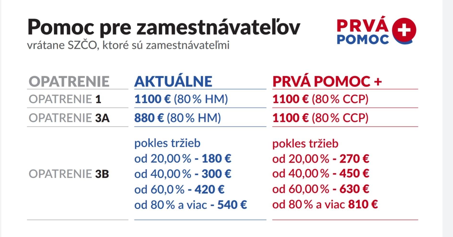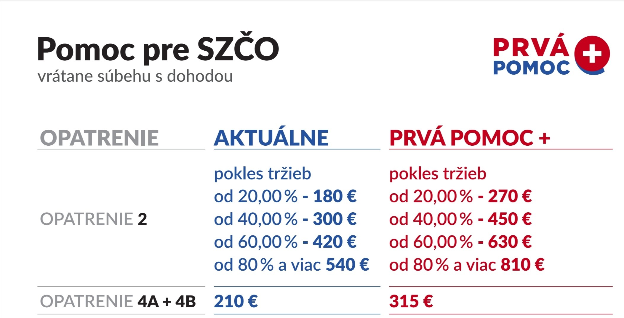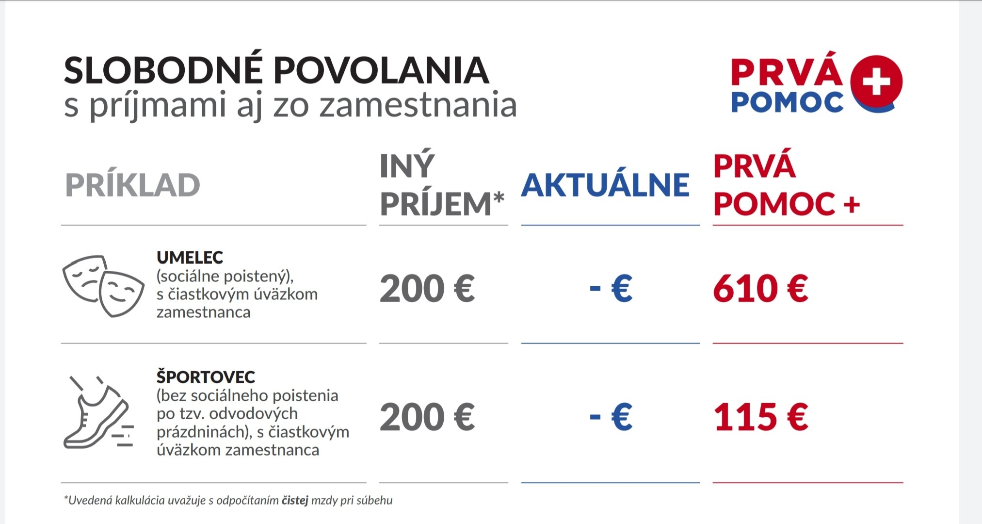 V rámci opatrení Prvá pomoc+ sa pamätá aj na pracovníkov v kultúrno-kreatívnom priemysle, ktorí na jar doplácali na súbeh zamestnaneckého pomeru a aktivít samostatne zárobkovo činnej osoby (SZČO). Po rokovaní vlády to uviedla ministerka kultúry Natália Milanová. Podľa výšky poklesu tržieb je nastavená finančná pomoc, oproti prvej vlne sa znásobila koeficientom 1,5 percenta. Pri poklese tržieb od 20 percent dostanú podnikatelia namiesto 180 eur z jari 270 eur na zamestnanca. Pri poklese tržieb od 40 percent sa pomoc zvyšuje z 300 eur na 450 eur, pri poklese od 60 percent z pôvodných 420 eur na 630 eur, a pri poklese tržieb od 80 percent a viac bude pomoc vo výške 810 eur na zamestnanca, namiesto 540 eur.