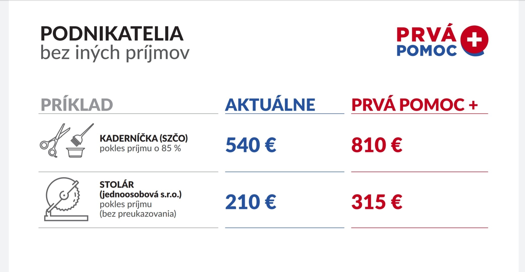 "Takže ten, ktorý je v súbehu zamestnaneckého pomeru a podnikania a prišiel o minimálne 80 percent tržieb, má nastavenú pomoc na 810 eur. Z tejto sumy sa odráta suma čistého zárobku zo zamestnaneckého pomeru. Teda, ak niekto zarobil v rámci zamestnania v čistom 200 eur, má nárok na príspevok vo výške 610 eur,“ priblížila ministerka.