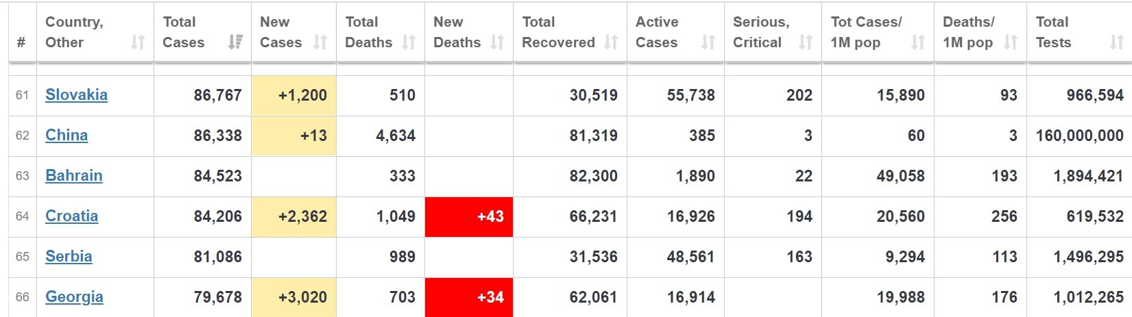 Práve dnešný deň sme tak predbehli a dostali sa jedno miesto pred Čínu, kde doteraz spolu zaznamenala 86.338 prípadov. Na Slovensku sme za sobotu zaznamenali 1200 nových prípadov, v Číne to býva v súčasnosti denne väčšinou menej ako 20 prípadov. Pokiaľ ide o počet aktuálne nakazených ľudí, na Slovensku je to 55.738. V Číne ich majú 385.