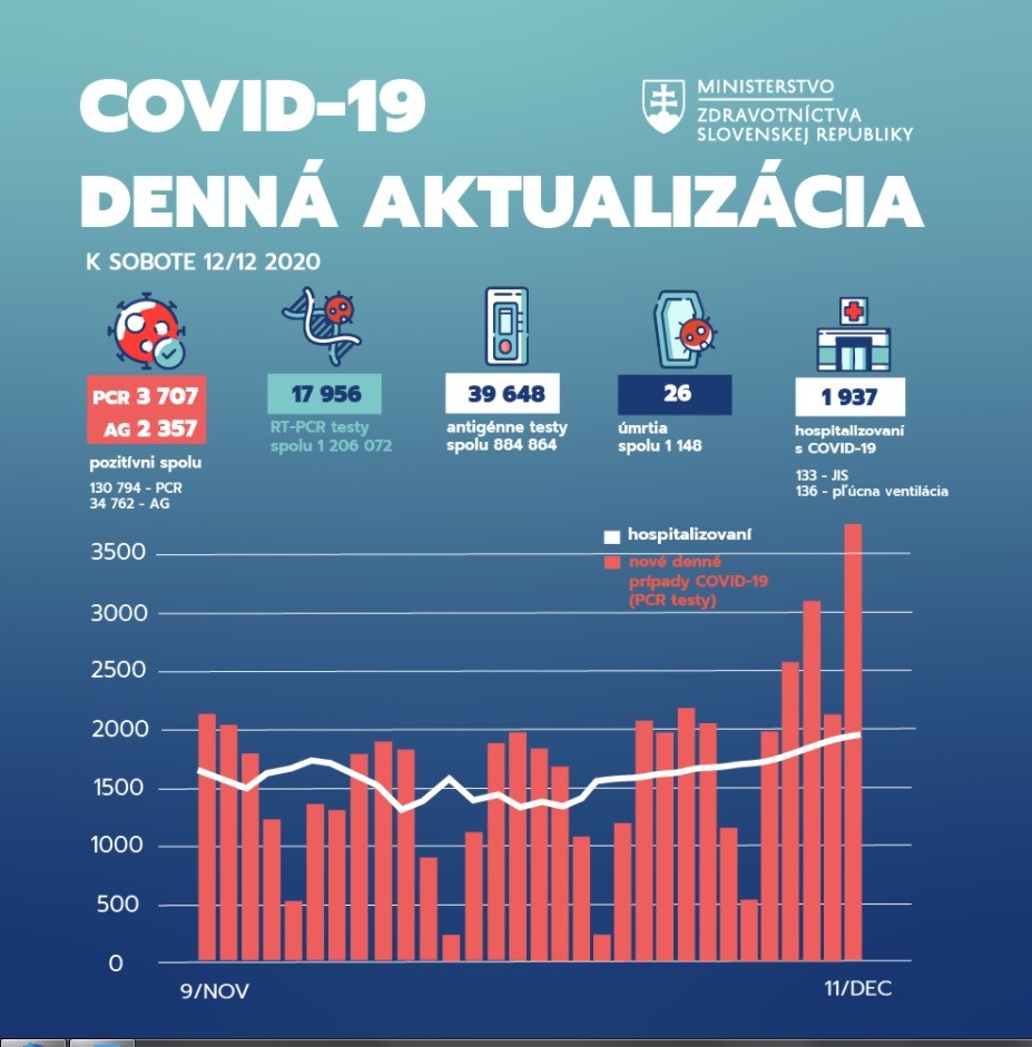 Na Slovensku za uplynulý deň pribudlo 3 707 pozitívne testovaných ľudí formou RT-PCR testov a 2 357 pozitívne testovaných antigénnymi testami. Je to 20,06 % z 17 956 pozitívne ukončených RT-PCR vyšetrení a 5,94 % z 39 648 antigénnych testov za včerajší deň.