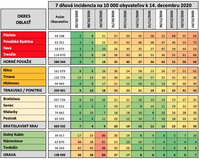 Analytik Ivan Bošňák vysvetlil, že v nedávnej minulosti vláda nechcela rozumieť dôležitým signálom. Exponenciálny rast nakazených je totiž veľmi zákerný a spočiatku vyzerá veľmi nenápadne. Preto dnes máme okresy, v ktorých je situácia katastrofálna, napríklad Púchov. Tu mali v októbri iba dvoch nakazených na 10-tisíc obyvateľov za týždeň. Teda bezproblémová situácia. Keď však začali čísla rásť, nikto tomu nevenoval dostatočnú pozornosť. V polovici decembra už je týchto nakazenýchv Púchove 69 na 10-tisíc obyvateľov týždenne. Rovnako je na tom napríklad Považská Bystrica, ktorá vyletela z čísla tri na 73. Slovensko totiž uvoľnilo v minulosti opatrenia (najmä otváranie prevádzok) vo všetkých okresoch (kostoly, kiná, divadlá, fitnescentrá, školy atď.), čo bola veľká chyba. Vyskúšať sa to podľa analytikov malo iba v zelených okresoch a tie postihnuté mali zostať uzatvorené a to vrátane škôl. Naopak, v iných regiónoch, ako je napríklad Orava, sa situácia výrazne zlepšila.