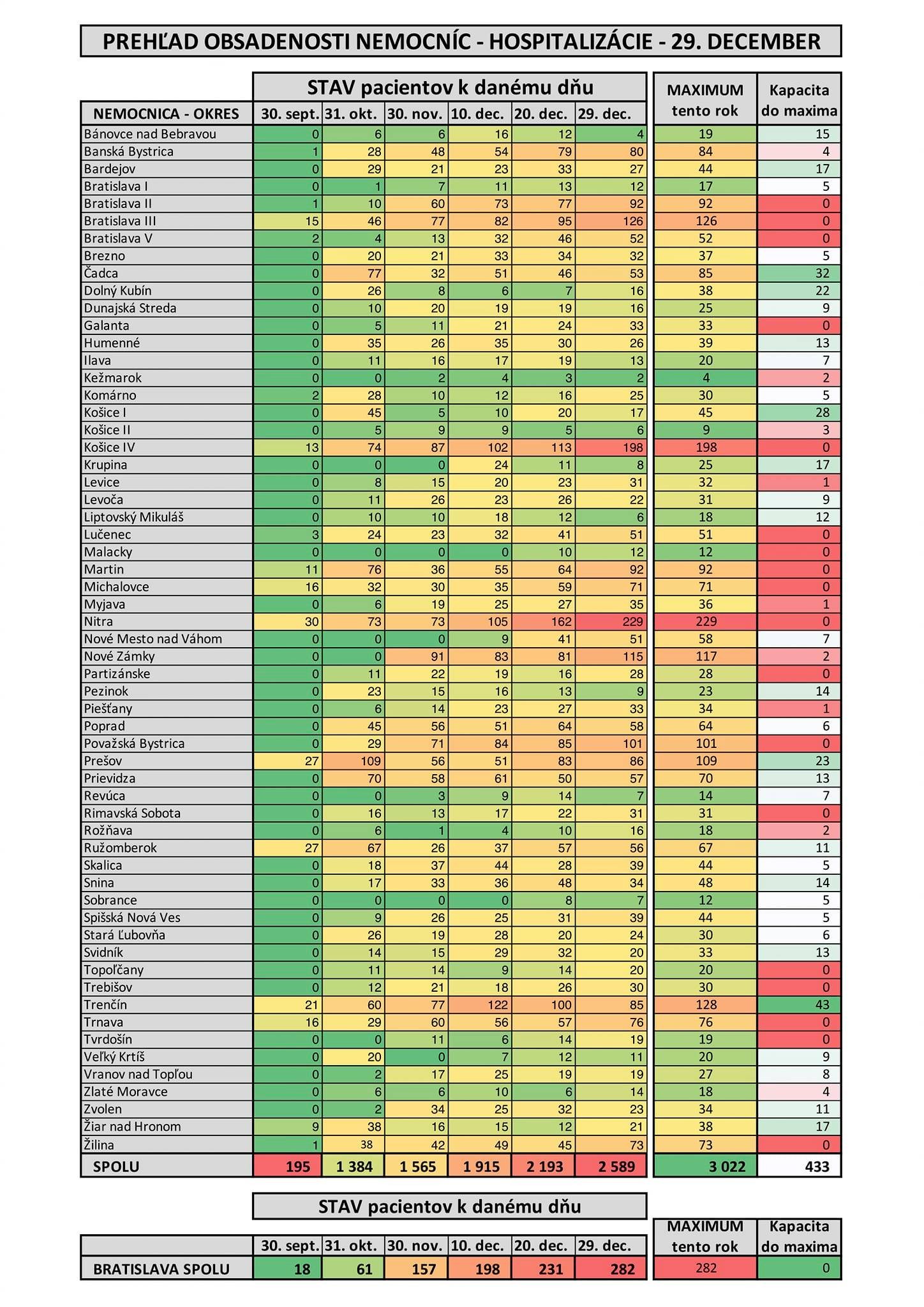 Na aktuálny stav v nemocniciach (k 29. decembru) upozornili známi dátoví analytici Ivan Bošňák a Jakub Tillinger, ktorí založili portál databezpatosu.sk. "Prinášame dáta k maximálnemu počtu pacientov, ktorí tento rok s COVID ležali v tej-ktorej nemocnici. Je možné predpokladať, že minimálne toľko pacientov vedia obslúžiť. Ak sú dnes na nižšom stave, tak vlastne majú voľnú kapacitu. Je to v niekoľkých nemocniach na severe, v Prešove," vysvetlili svoju grafiku analytici.