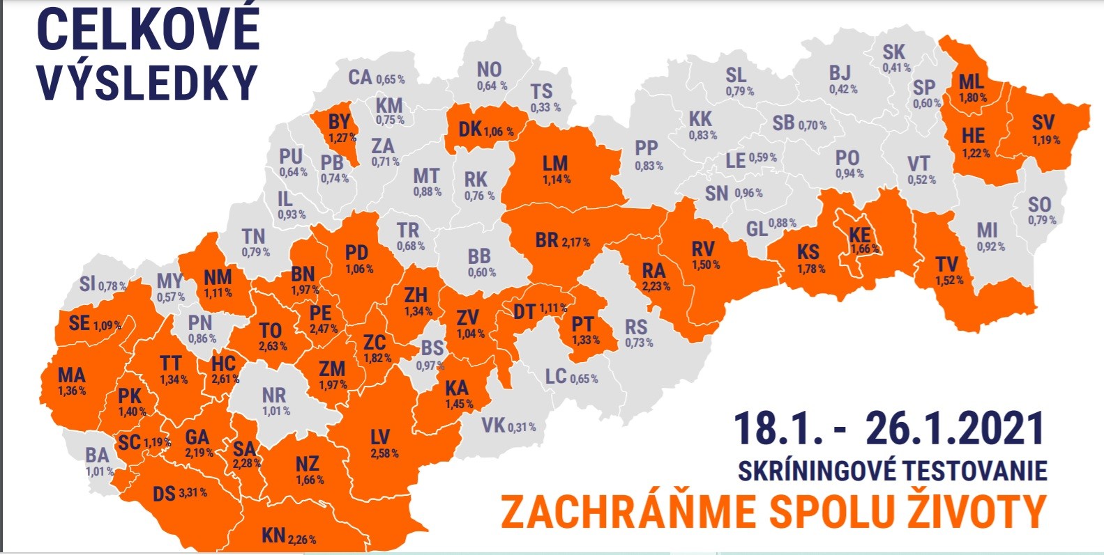 Do skríningového plošného testovania na ochorenie COVID-19 v termíne od 18. do 26. januára sa zapojilo 2.949.017 ľudí. Pozitívny výsledok malo 36.547 z nich, čo predstavuje 1,24 percenta.
