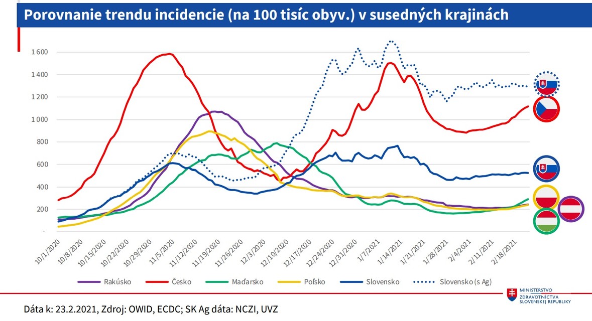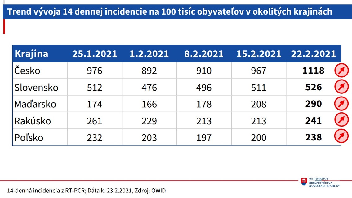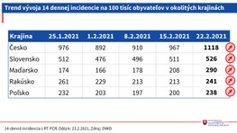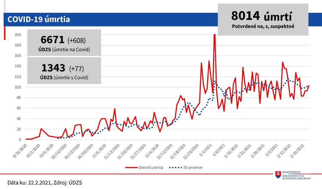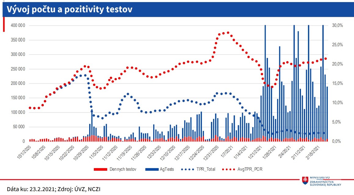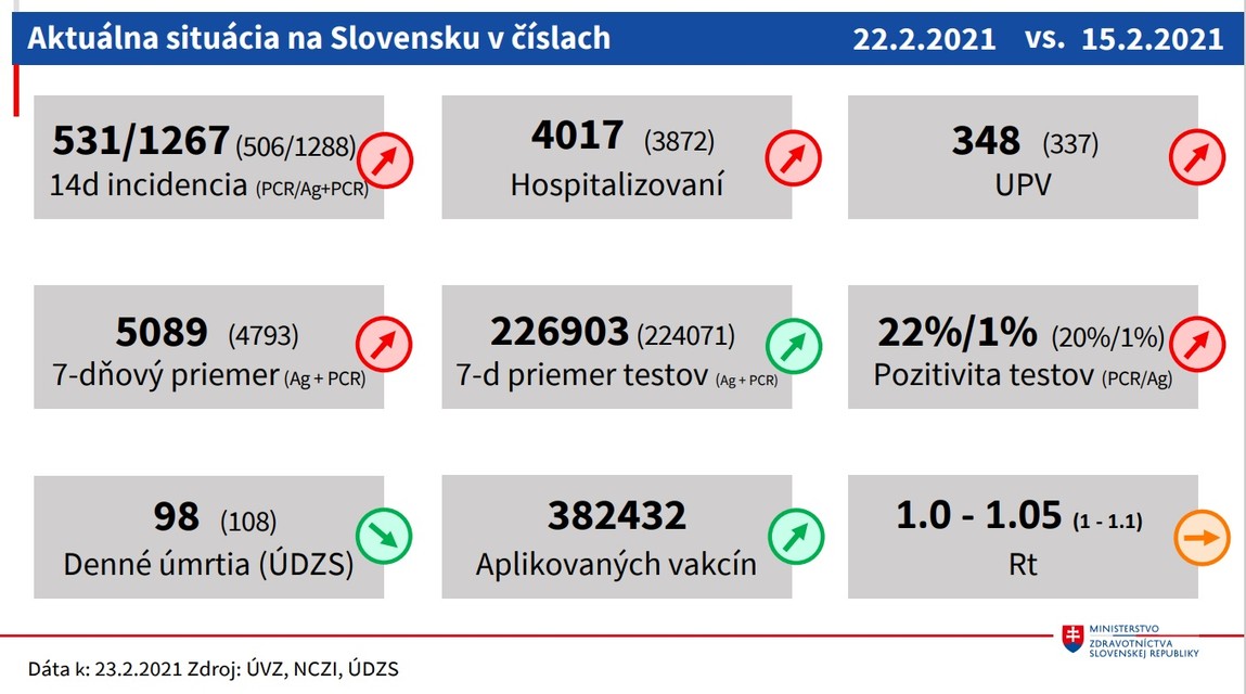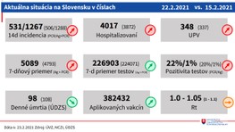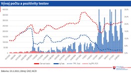 Okrem hospitalizácií stúpol aj počet pacientov na umelej pľúcnej ventilácii z 337 na 348. Sedemdňový priemer vykonaných testov je 226.903. Pozitivita vykonaných PCR testov je na úrovni 22 percent a pozitivita vykonaných antigénových testov je na úrovni jedného percenta. Krajčí dodal, že sedemdňový priemer pozitívnych PCR aj antigénových testov sa zvýšil z 4793 na 5089. V prípade PCR testov je to 2156. Zvýšil sa aj počet výjazdov zdravotnej záchrannej služby k pacientom s novým koronavírusom. OAIM lôžka s umelou pľúcnou ventiláciou sú obsadené na 85 percent. "Predpokladáme, že pozitívny efekt vakcinácie sa začne prejavovať v nasledujúcich dvoch - troch týždňoch,“ uviedol epidemiológ Pavol Jarčuška.