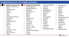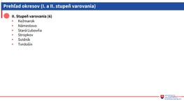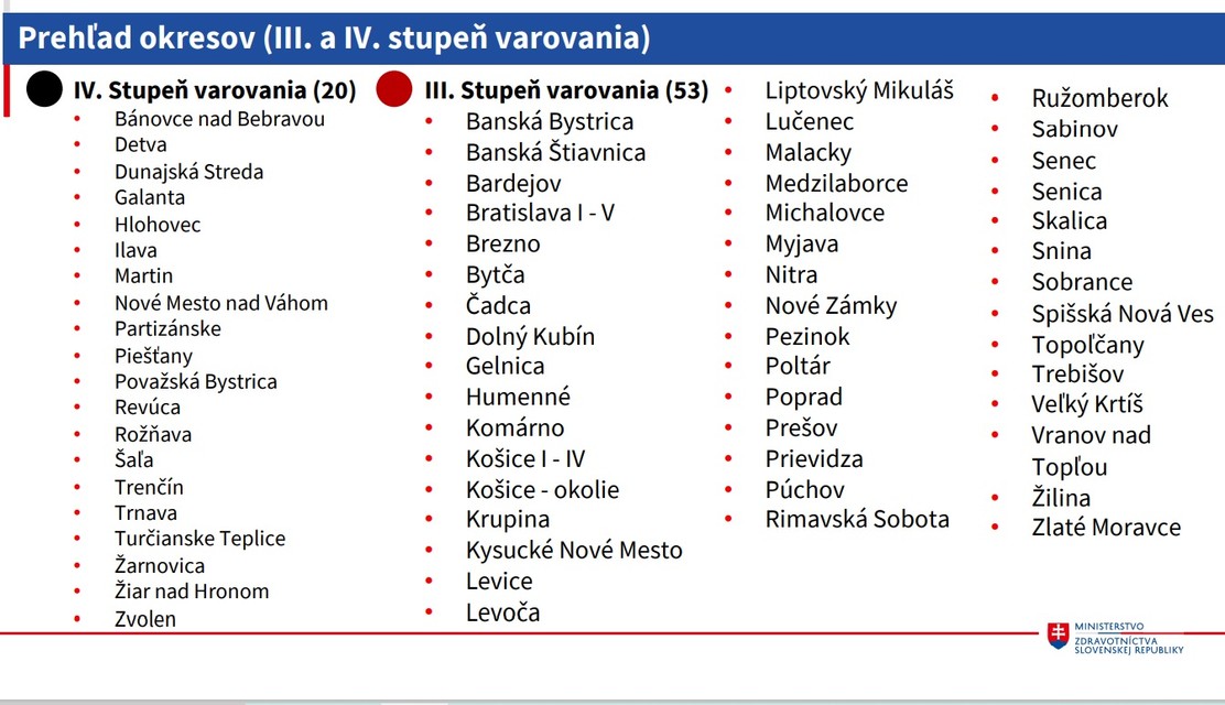 V čiernom, teda štvrtom stupni varovania sa nachádza 20 okresov. Ide o okresy Bánovce nad Bebravou, Detva, Dunajská Streda, Galanta, Hlohovec, Ilava, Martin, Nové Mesto nad Váhom, Partizánske, Piešťany, Považská Bystrica, Revúca, Rožňava, Šaľa, Trenčín, Trnava, Turčianske Teplice, Žarnovica, Žiar nad Hronom a Zvolen.