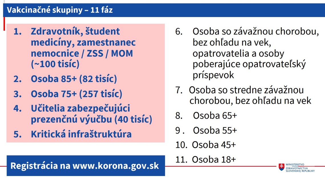 Pokiaľ ide o ruskú vakcínu Sputnik V, tá by sa na Slovensku mohla podávať záujemcom v rámci tretej fázy jej klinického testovania, pokiaľ by sa ju nepodarilo registrovať. Slovensko by tiež mohlo podľa jeho slov získať 100.000 vakcín od členských krajín Únie, ktoré by sme im v apríli vrátili. Avizoval tiež, že po novom by sa prioritne mohli očkovať aj predavači do 55 rokov, a to vakcínou od firmy AstraZeneca.