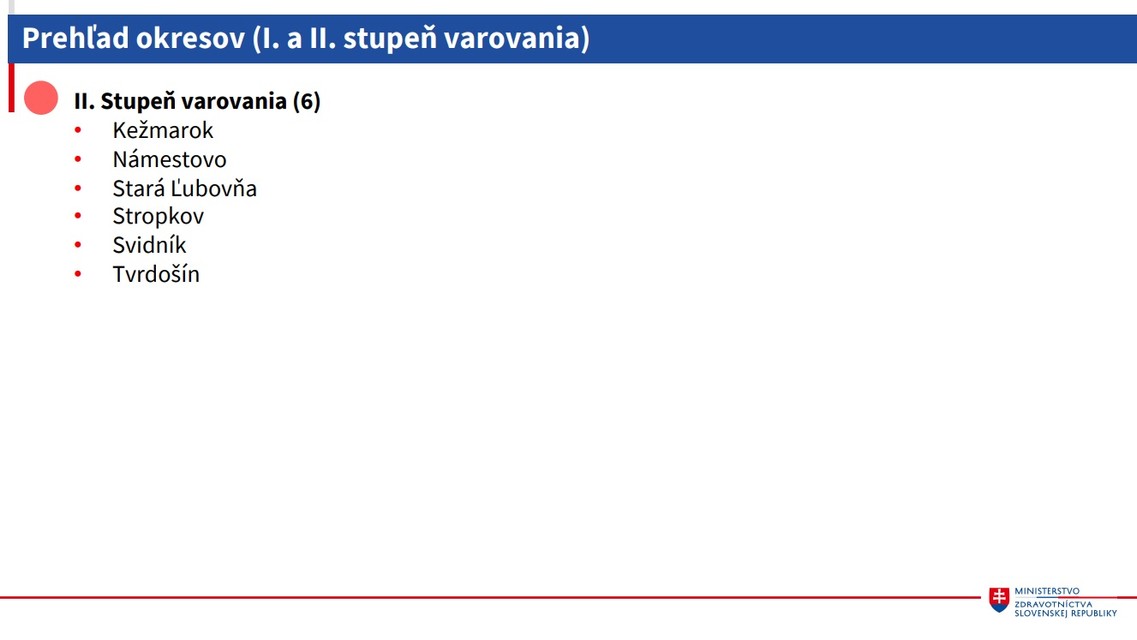 V druhom, červenom stupni varovania sa nachádza šesť okresov. Ide o okresy Kežmarok, Námestovo, Stará Ľubovňa, Stropkov, Svidník a Tvrdošín.