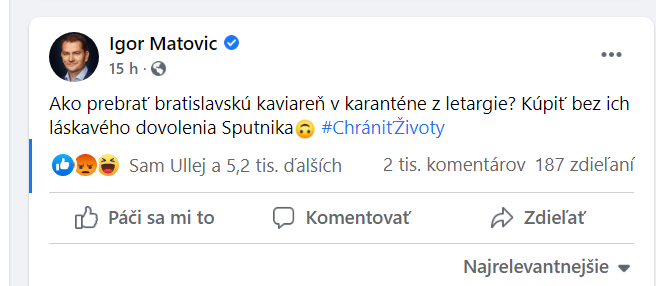 Premiér Igor Matovič včera poobede na sociálnej sieti v súvislosti so zabezpečením ruských vakcín na Slovensko napísal takýto status: "Ako prebrať bratislavskú kaviareň v karanténe z letargie? Kúpiť bez ich láskavého dovolenia Sputnika." Neskôr dodal, že ďakuje tým, ktorí chápu rozhodnutie zabezpečiť pre ľudí okrem už nedostatočného množstva kontrahovaných vakcín cez Európsku komisiu aj ruskú vakcínu Sputnik V.