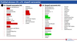 V štvrtom stupni varovania sa budú nachádzať po novom okresy Bánovce nad Bebravou, Čadca, Dolný Kubín, Dunajská Streda, Galanta, Gelnica, Humenné, Ilava, Košice I - IV, Košice-okolie, Krupina, Kysucké Nové Mesto, Martin, Myjava, Nové Mesto nad Váhom, Piešťany, Považská Bystrica, Púchov, Revúca, Rimavská Sobota, Rožňava, Ružomberok, Šaľa, Senica, Skalica, Trebišov, Trenčín, Trnava, Turčianske Teplice, Zvolen, Žarnovica a Žiar nad Hronom.