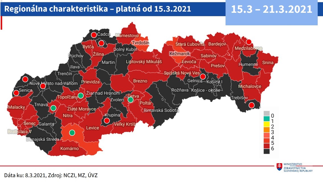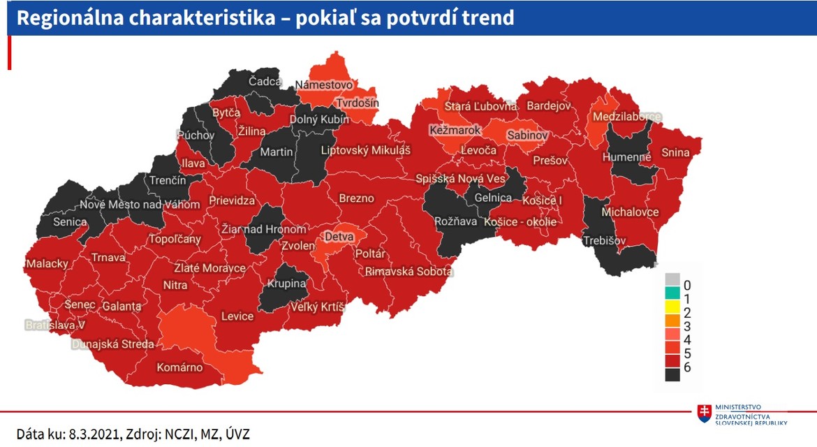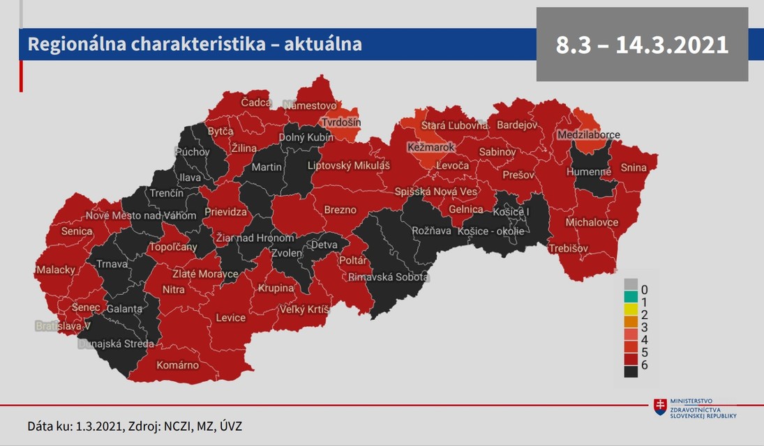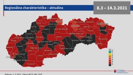 Od budúceho pondelka (15. 3.) bude podľa COVID automatu 35 okresov v čiernej zóne, teda v štvrtom stupni varovania. V bordovej zóne ich bude 41, v červenej budú tri.