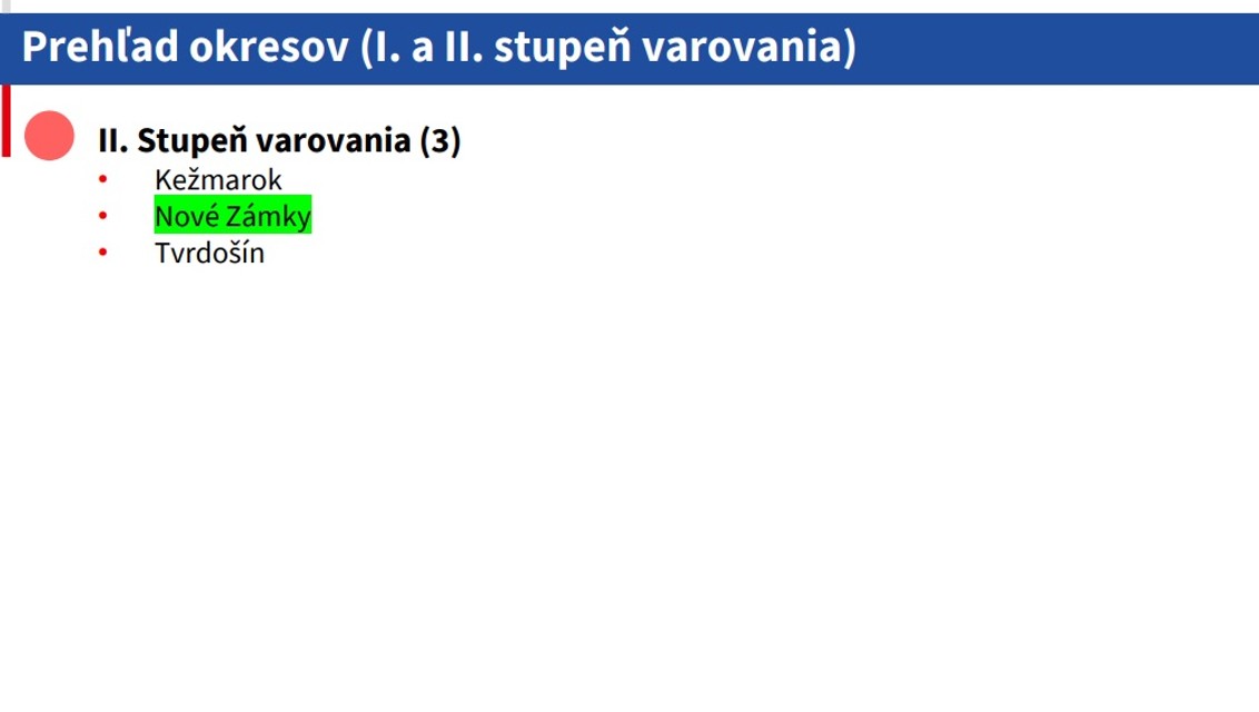 V druhom stupni varovania sa budú nachádzať len okresy Kežmarok, Nové Zámky a Tvrdošín.