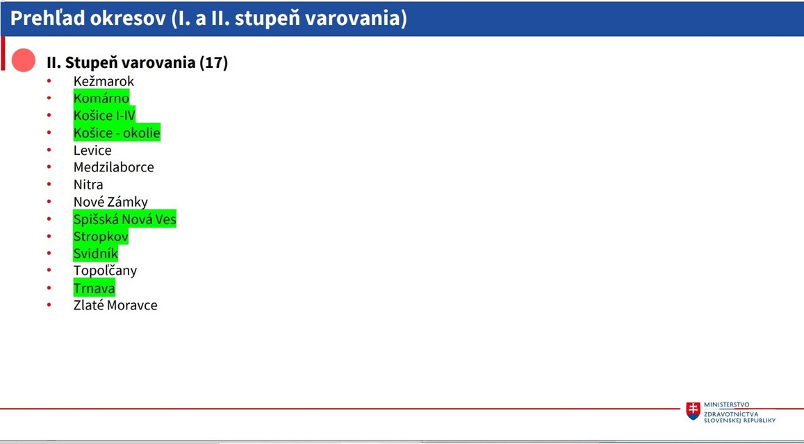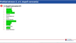 V druhom stupni varovania sa budú nachádzať okresy Kežmarok, Komárno, Košice I - IV, Košice-okolie, Levice, Medzilaborce, Nitra, Nové Zámky, Spišská Nová Ves, Stropkov, Svidník, Topoľčany, Trnava a Zlaté Moravce.