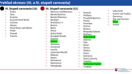 V treťom stupni sa budú nachádzať okresy Bánovce nad Bebravou, Banská Bystrica, Banská Štiavnica, Bardejov, Bratislava I- IV, Brezno, Bytča, Detva, Dolný Kubín, Dunajská Streda, Galanta, Gelnica, Hlohovec, Humenné, Levoča, Liptovský Mikuláš, Malacky, Martin, Michalovce, Námestovo, Partizánske, Pezinok, Piešťany, Považská Bystrica, Prešov, Prievidza, Púchov, Revúca, Rimavská Sobota, Rožňava, Ružomberok, Sabinov, Šaľa, Senec, Senica, Skalica, Snina, Sobrance, Stará Ľubovňa, Trebišov, Turčianske Teplice, Tvrdošín, Veľký Krtíš, Vranov nad Topľou, Žarnovica, Žiar nad Hronom, Žilina a Zvolen.