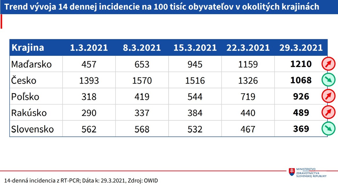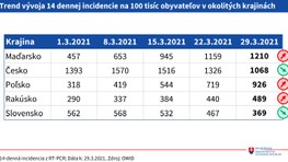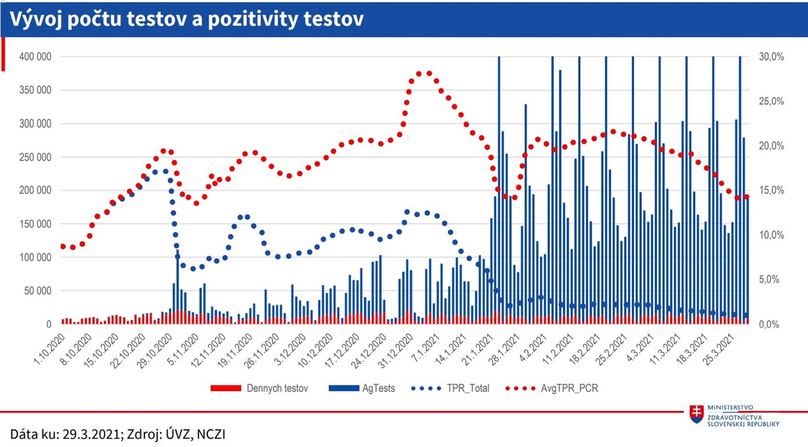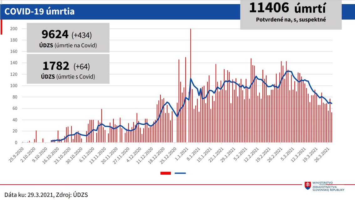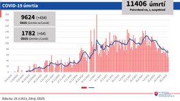 V posledných týždňoch klesol počet výjazdov záchrannej zdravotnej služby k pacientom s ochorením COVID-19 alebo s podozrením naň. Od konca februára klesá podľa štatistík rezortu aj priemerný denný počet príjmov pacientov v nemocniciach. K pondelku (29. 3.) bolo 671 zdravotníckych pracovníkov pozitívnych na nový koronavírus. Vysoká je ale stále obsadenosť lôžok pre kritických pacientov s ochorením COVID-19. Celkovo na ochorenie zomrelo 9624 osôb a s ochorením 1782 ľudí. "Takmer všetky ukazovatele klesli, cítia to aj nemocnice," dodal Peter Stachura, štátny tajomník MZ.