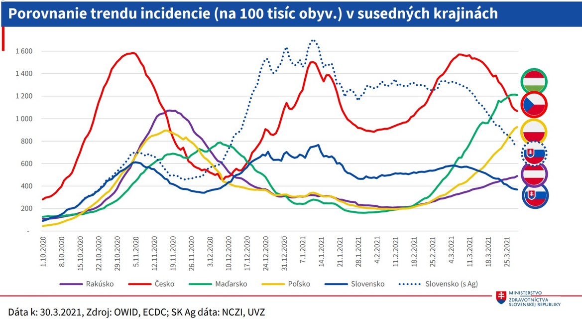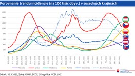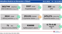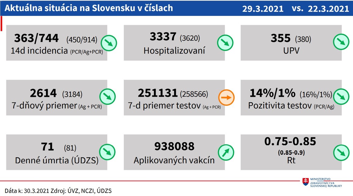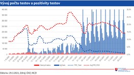 Klesajú počty pozitivity vykonaných testov, znížilo sa reprodukčné číslo, klesá počet úmrtí a v nemocniciach je menej pacientov. Menej pacientov tiež potrebuje umelú pľúcnu ventiláciu. Naopak, stúpa počet zaočkovaných proti ochoreniu COVID-19, rovnako ako počty vakcín.