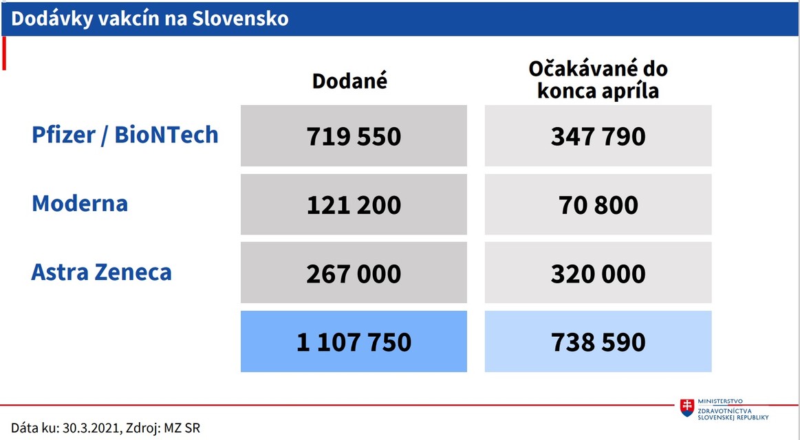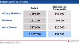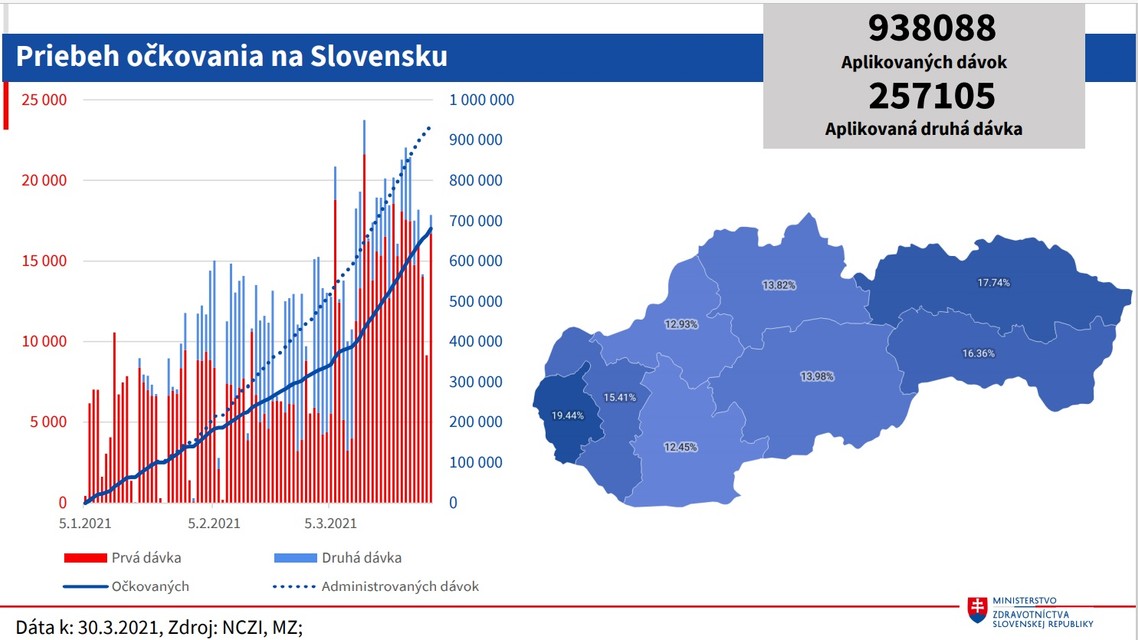 Štátna tajomníčka rezortu zdravotníctva Jana Ježíková priblížila, že Slovensko využilo 938.088 dávok vakcín, z toho druhú dávku dostalo 257.105 osôb. "Máme čoraz vyššie dodávky vakcín aj očkovacie kapacity," skonštatovala Ježíková. Zaočkovaných je 12,5 percenta obyvateľstva, z toho 4,7 percenta aj druhou dávkou. Výrazne podľa nej vzrástla aj zaočkovanosť zariadení sociálnych služieb v jednotlivých krajoch.