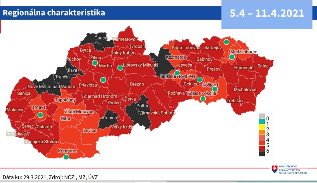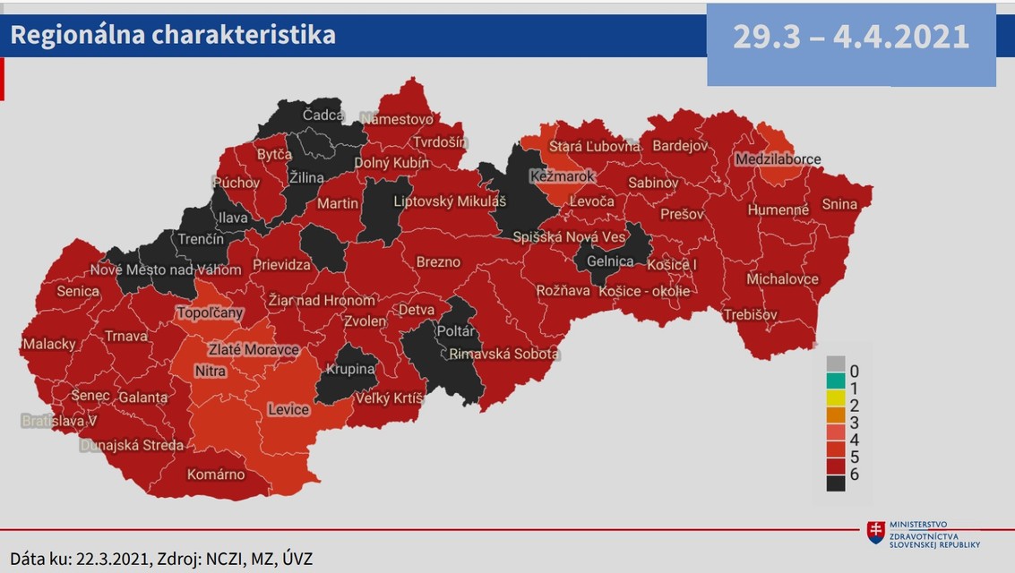 Od budúceho pondelka (5. 4.) bude podľa COVID automatu desať okresov v čiernej zóne, teda vo štvrtom stupni varovania. V bordovej zóne ich bude 52, v červenej bude 17 okresov.