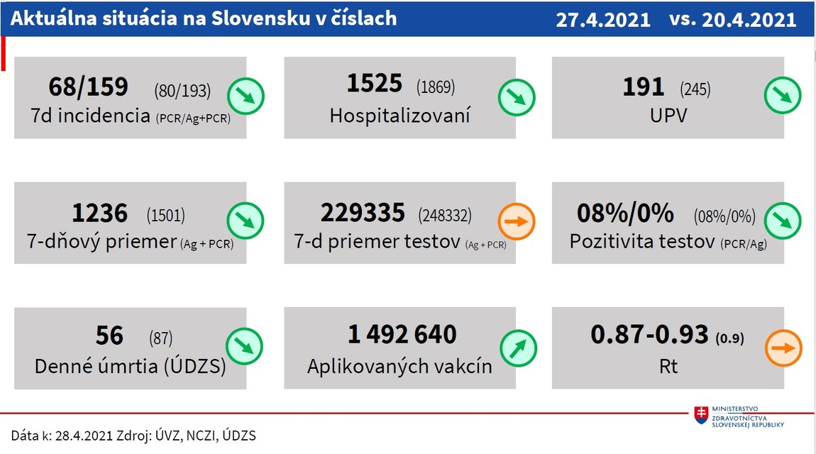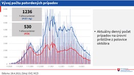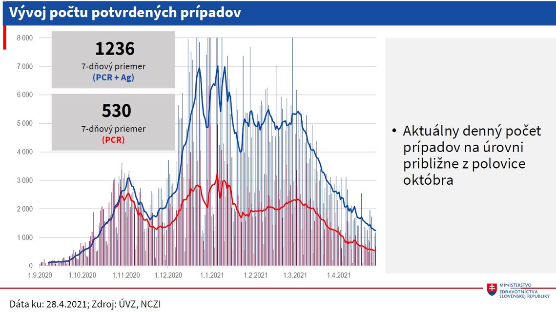Aktuálny denný počet prípadov je podľa rezortu na úrovni približne z polovice októbra. Poklesol počet pozitívnych antigénových testov aj PCR testov. Výrazne sa zmenšili rozdiely medzi regiónmi, priblížilo MZ.