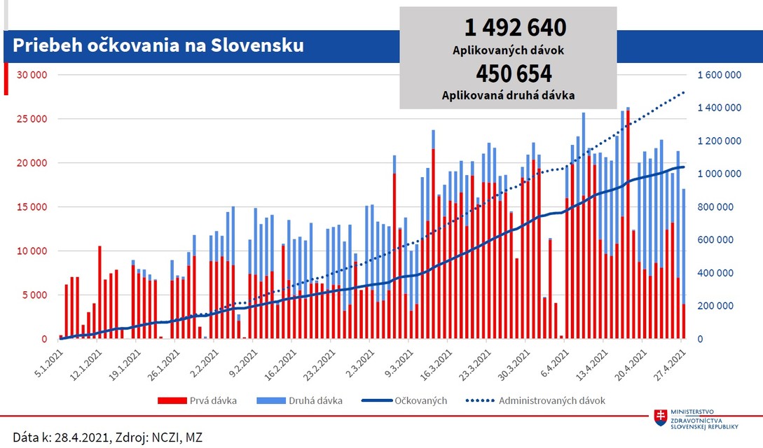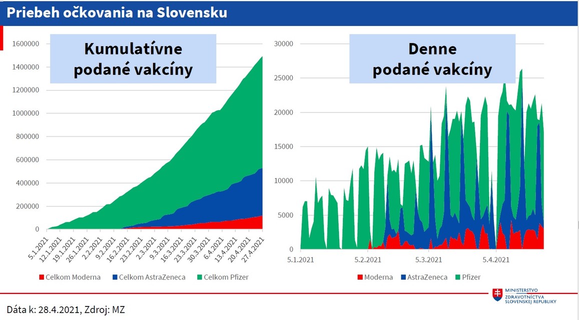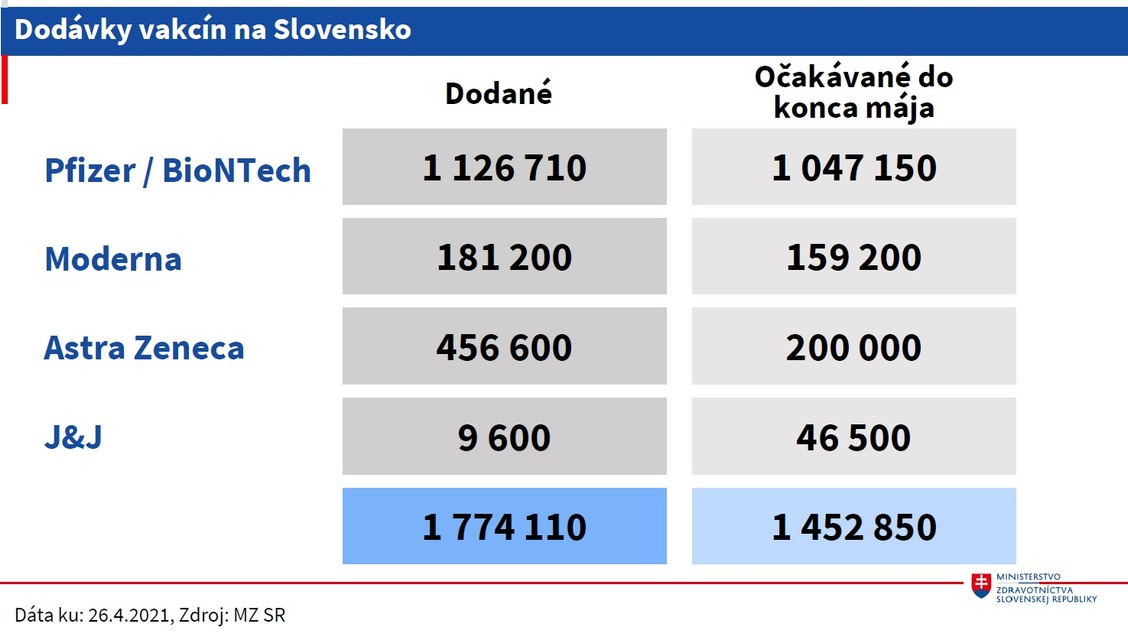 Do konca mája očakáva ministerstvo 1.047.150 dávok vakcín od spoločnosti Pfizer/BioNTech. Od spoločnosti Moderna to má byť 159.200, AstraZeneca má dodať 200.000 dodávok a od firmy Johnson & Johnson by malo prísť 46.500.