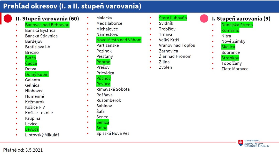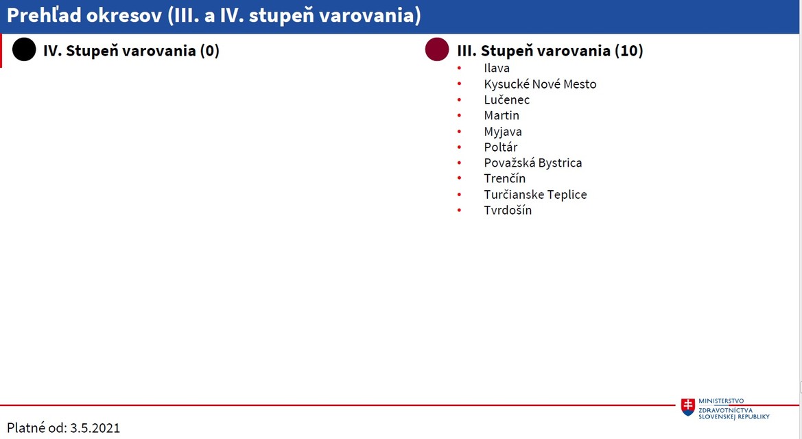 Slovensko od 3. mája prechádza podľa COVID automatu do druhého stupňa varovania, červenej fázy. Pravidlá pre okresy sa budú určovať na základe regionálnej situácie a podľa farby okresu. Informovala o tom hovorkyňa Ministerstva zdravotníctva Zuzana Eliášová.