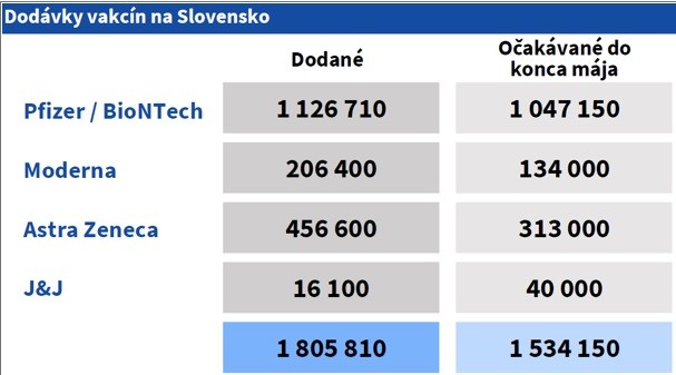 Do konca mája je na Slovensko plánovaná dodávka vakcín v celkovom objeme 1 534 150. Najviac by malo byť od konzorcia Pfizer/BioNTech. Od tohto výrobcu by malo byť dodaných 1 047 150 vakcín. "Ministerstvo zdravotníctva, po dôkladnej analýze, umožňuje registráciu na mRNA vakcíny (Pfizer a Moderna) ľuďom nad 50 rokov. Doteraz sa vakcínami Pfizer a Moderna očkovala veková skupiny od 60 rokov a chronicky chorí pacienti. Mladší ako 50 rokov sa môžu registrovať na očkovanie vakcínou AstraZeneca. Aktuálne nie je možný výber vakcíny," informovala hovorkyňa ministerstva zdravotníctva Zuzana Eliášová.