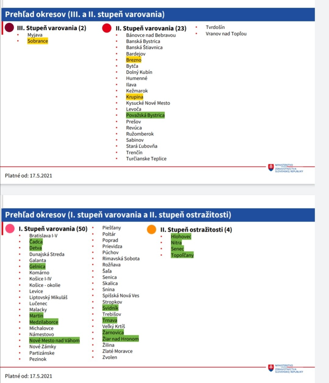 Vo všetkých okresoch sa od pondelka (17. 5.) ruší povinnosť v obchodných domoch merať teplotu. Na vstup nebude potrebný ani negatívny test na ochorenie COVID-19. Čo sa týka konzumácie jedál a nápojov v obchodných domoch, naďalej bude trvať zákaz pre okresy v treťom stupni varovania - bordové okresy. V ostatných bude povolená, podrobnejšie podmienky budú závisieť od stupňa varovania. Ostávajú však zatvorené detské kútiky a sedacie sekcie a obmedzenia kapacity obchodných domov stanoví vyhláška v závislosti od farby okresu.
