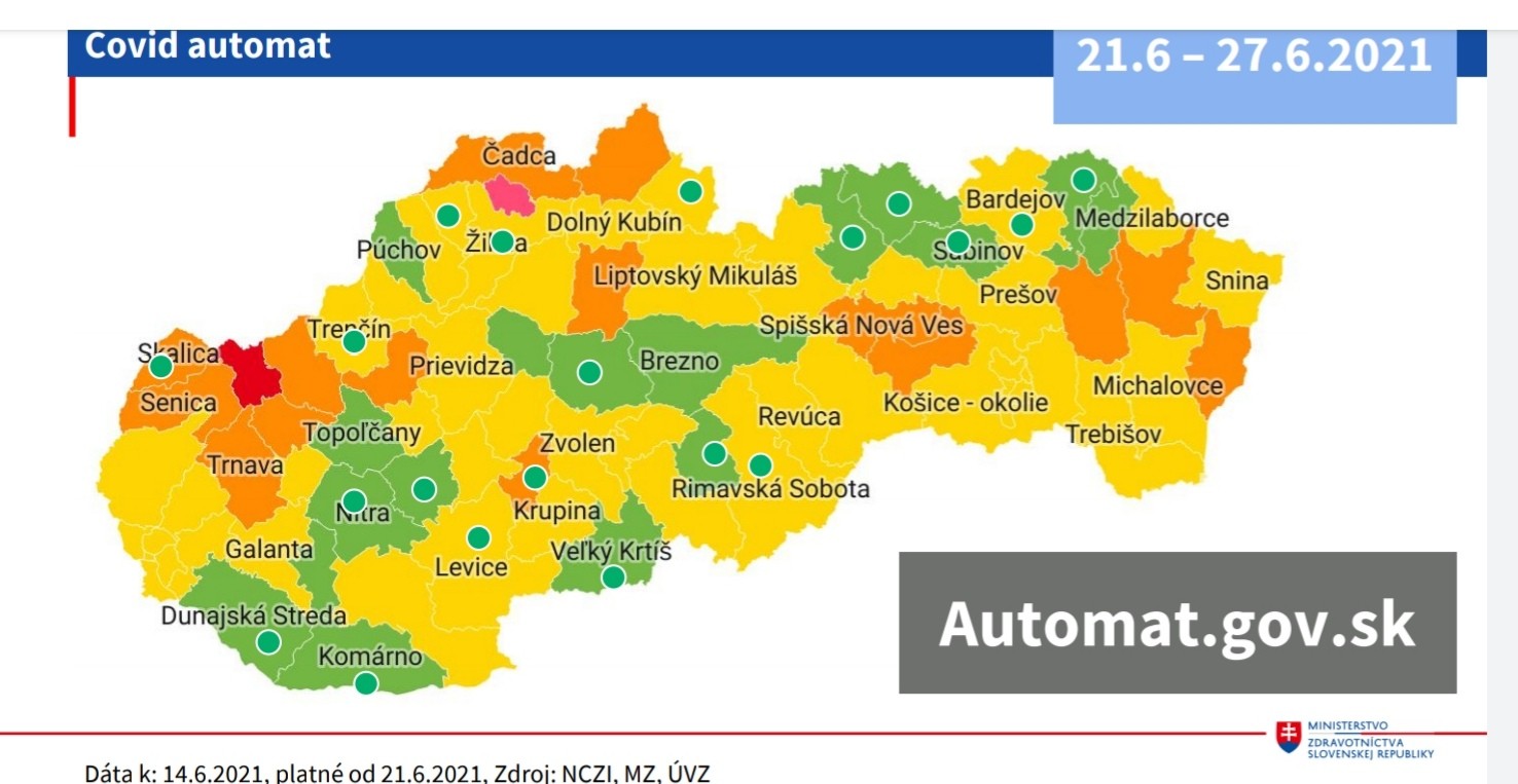 Od budúceho pondelka (21. 6.) nebude podľa COVID automatu ani jeden okres v čiernej fáze. V druhom aj prvom stupni varovania bude zhodne po jednom okrese. V druhom stupni ostražitosti ich bude 15 a v prvom stupni ostražitosti 44. Bratislava bude v prvom stupni, teda žltá.